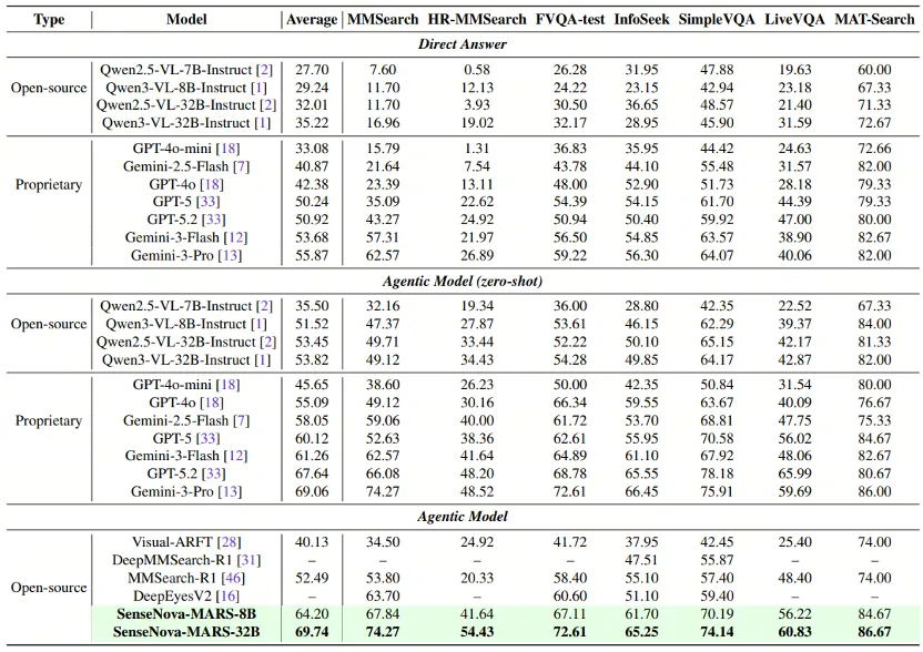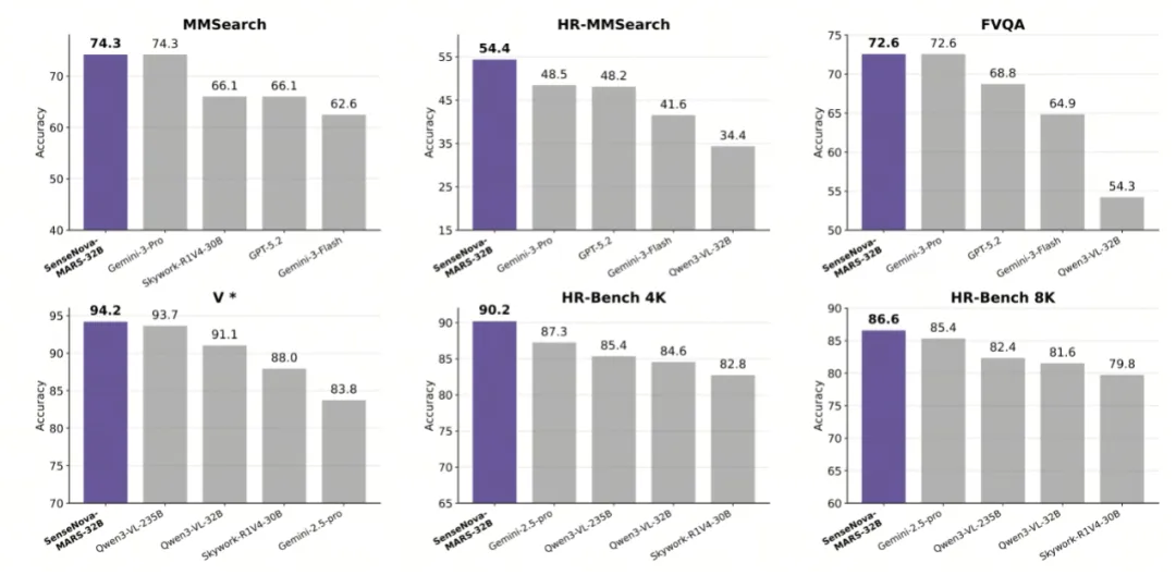 在 MMSearch、HR-MMSearch、FVQA、InfoSeek、SimpleVQA、LiveVQA等基准测试中,SenseNova-MARS取得开源模型中的 SOTA 成绩,还超越Gemini-3.0-Pro、GPT-5.2等顶级闭源模型,在搜索推理和视觉理解两大核心领域全面领跑。更多细节请参见技术报告(https://arxiv.org/abs/2512.24330),欢迎开发者、各行业用户测试与体验。