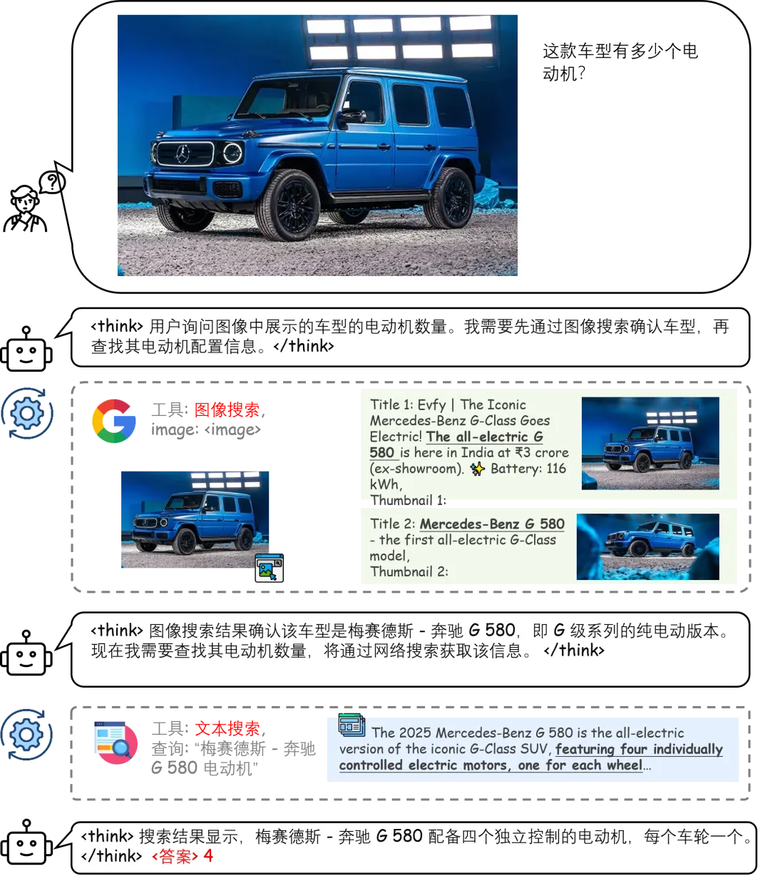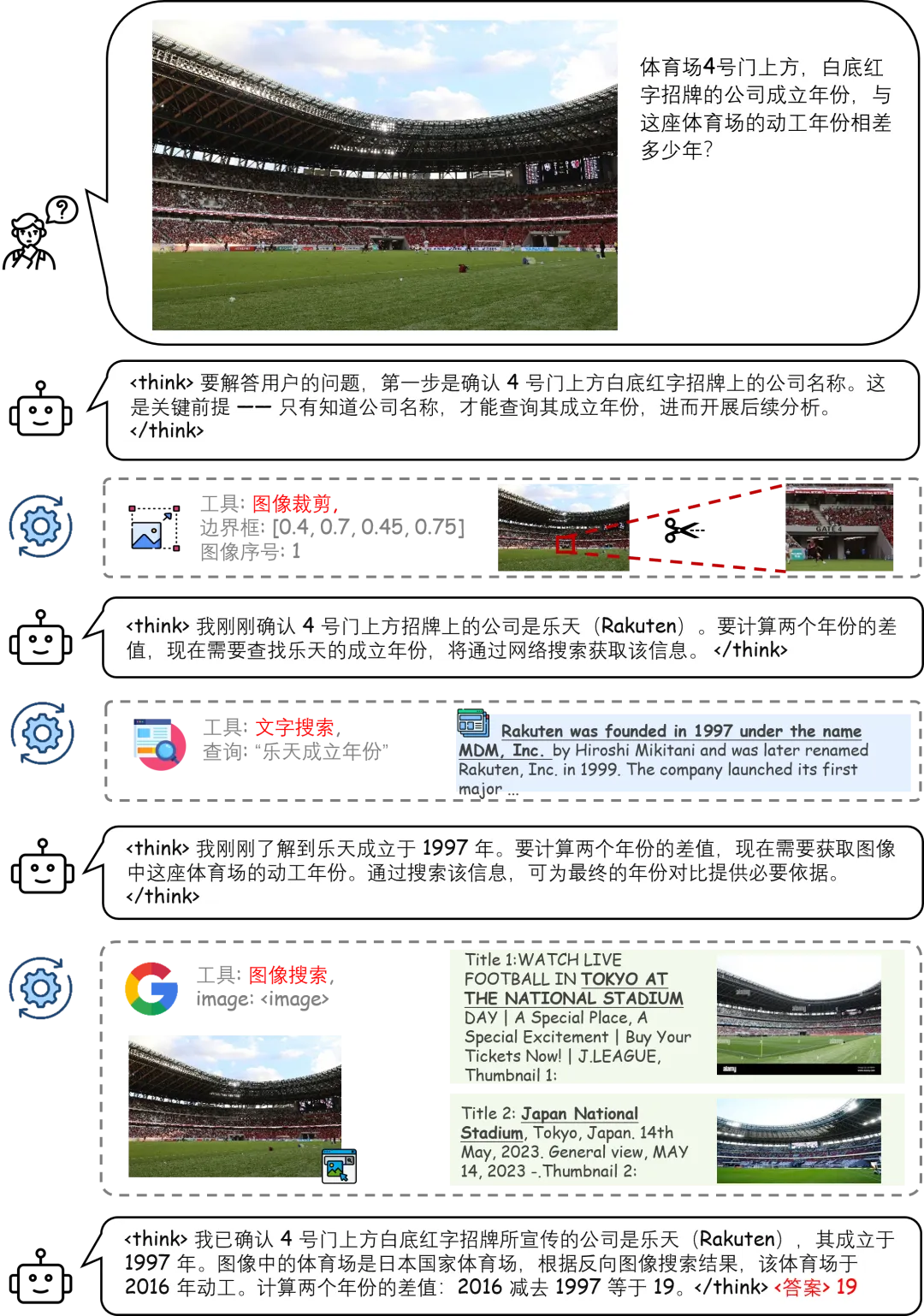 面对识别赛车服微小 logo + 查询公司成立年份 + 匹配车手出生年月 + 计算差值’的复杂任务,SenseNova-MARS 可自主调用图像裁剪、文本 / 图像搜索工具,无需人工干预完成闭环解答。