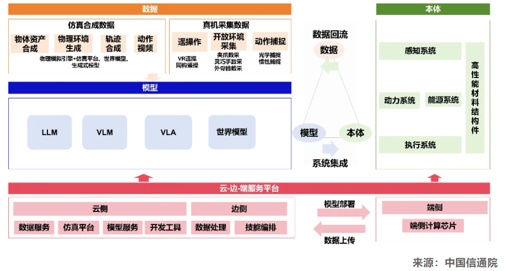 2. 数据驱动下开展软硬融合创新,围绕“数据-模型-本体”三个关键技术要素及支撑技术加快探索。具身智能有别于传统AI线性的“输入数据-输出答案”模式,需要在物理环境的交互中形成自主进化的智能闭环:本体被部署到真实场景中→在执行任务中收集真实行为数据→高质量数据被用于模型训练和迭代→更通用的模型被部署到更多的机器人上,从而收集更多、更高质量的数据。数据是闭环飞轮启动起点,具身智能在数据驱动下实现软硬融合创新,围绕“数据-模型-本体”三个关键技术要素展开多路径探索,云边端协同支撑系统研发和在现实环境中的有效运行。