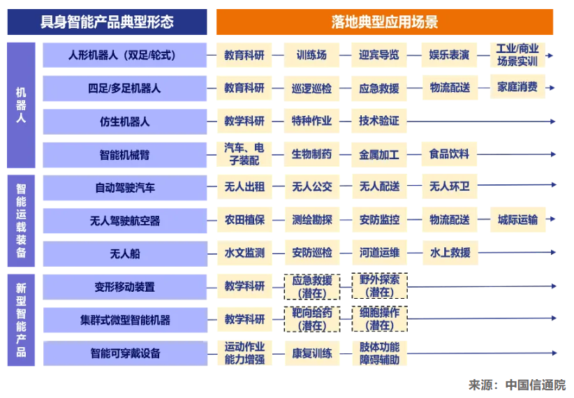 4. 具身智能在场景驱动下的产品谱系不断丰富,多元化产品从生产作业到生活服务,从常规作业环境到上天入海涉险,加速细分场景拓展。我国超大市场规模为具身智能应用落地提供更多机会,多样化场景需求也催生了具身智能产品谱系的不断丰富。目前具身智能产品包括机器人、智能运载装备和新型智能产品三大类,以人形机器人、复合轮臂机器人(轮式底盘结合双臂)为代表的新兴具身智能产品以科研、训练场、娱乐表演或特定场景试点为主,部分产品在逐步推进行业场景的小规模应用。