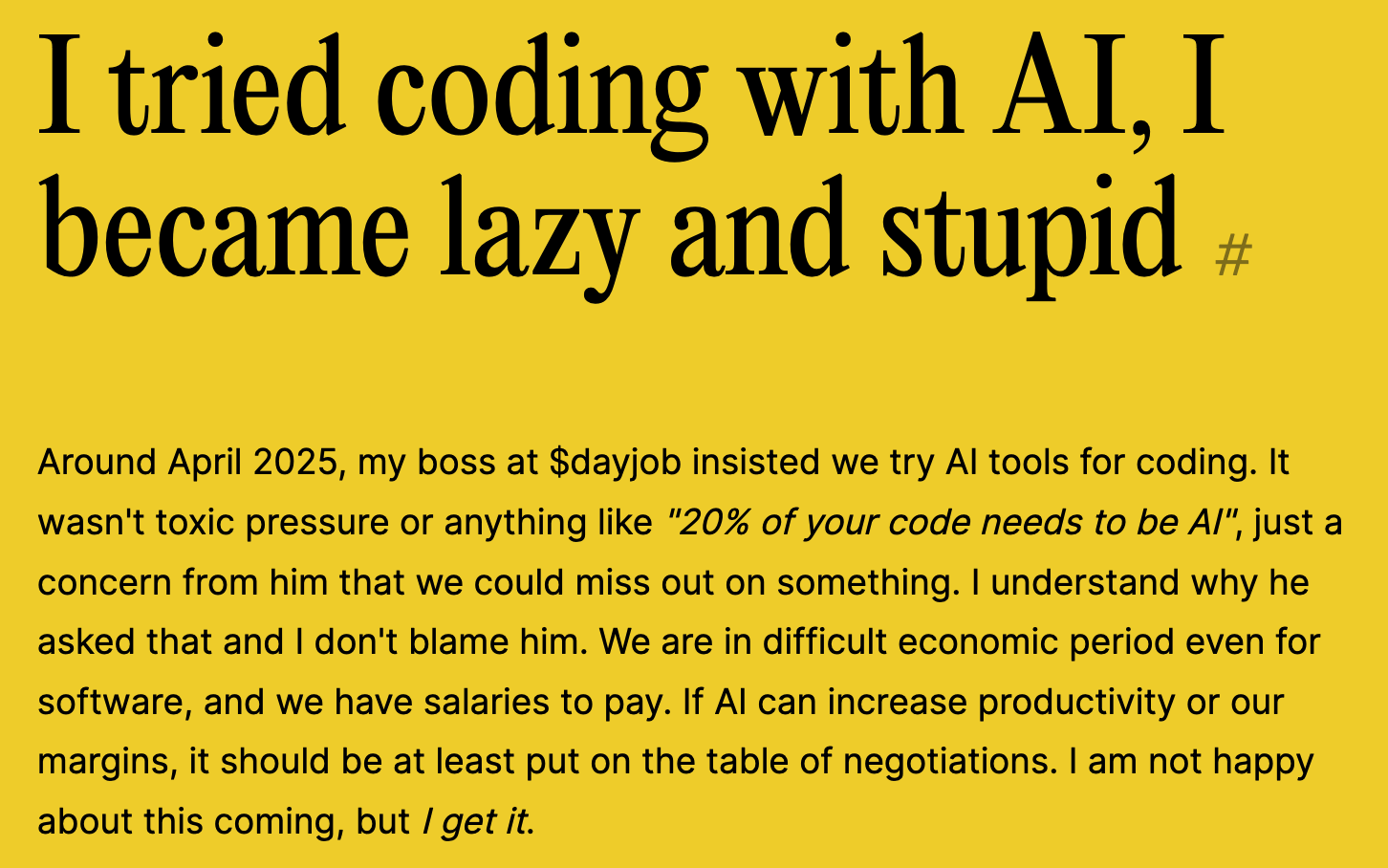 我其实早就知道这一点——已经有研究表明,使用 LLM 会让人变笨,而自我感知到的生产力提升并不真实。但亲身经历这一切,感受完全不同。