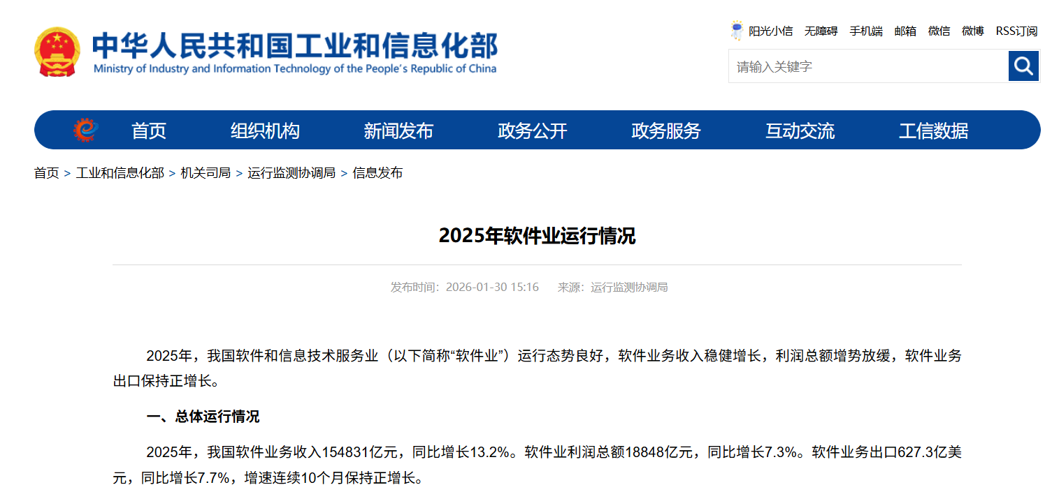 工业和信息化部运行监测协调局发布 “2025年软件业运行情况” 指出,2025年,我国软件和信息技术服务业(以下简称“软件业”)运行态势良好,软件业务收入稳健增长,利润总额增势放缓,软件业务出口保持正增长。