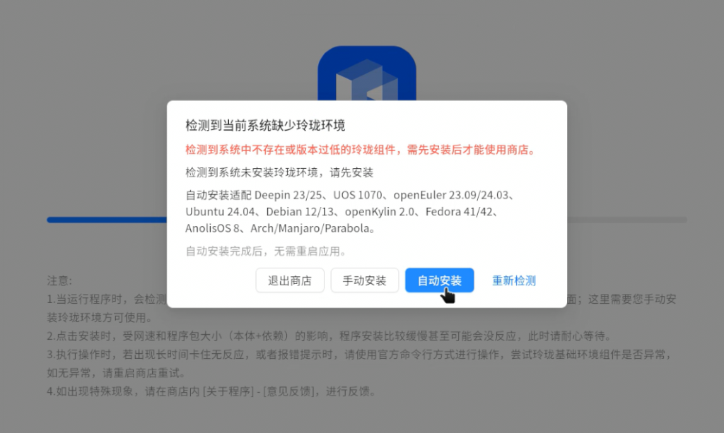 安装器会自动检测系统环境和架构,下载安装对应版本的玲珑运行环境和玲珑商店。