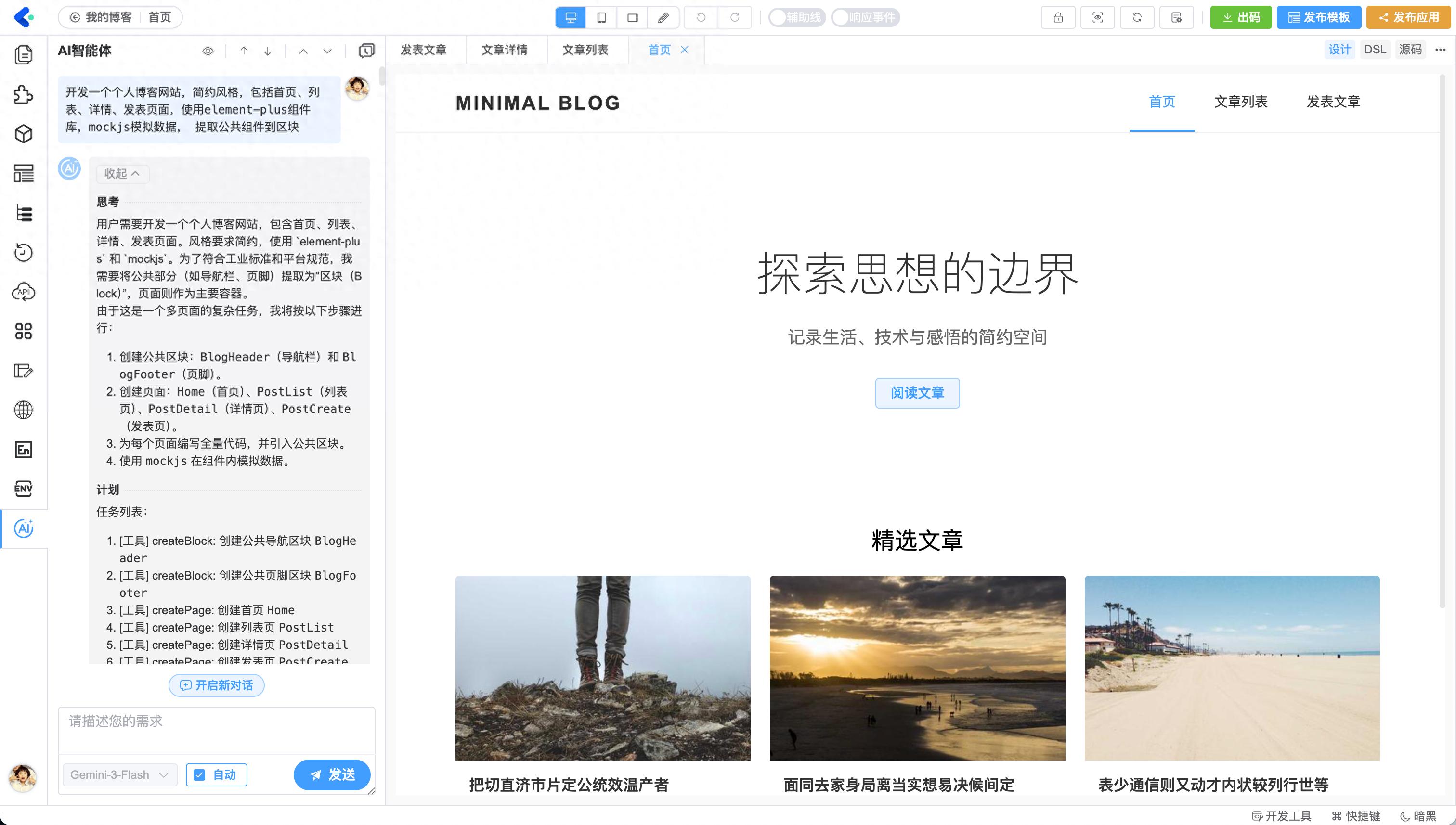 “开发一个个人博客网站,简约风格,包括首页、列表、详情、发表页面,使用element-plus组件库,mockjs模拟数据,提取公共组件到区块。”