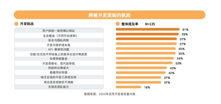 开发者端同样面临严峻挑战,61%的开发者认为多终端交互逻辑与分辨率差异导致用户体验一致性难以保证。中国市场长期的PC与移动端应用分发、账号体系、支付机制割裂,使双端开发成本高昂且版本更新滞后。约66%的内容类应用目前仅支持移动端,供需层面存在巨大差距。API兼容性问题、性能优化难度以及数据同步困难,成为了开发者跨入PC蓝海的现实壁垒。