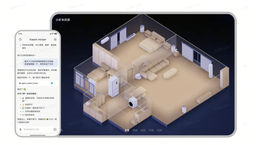 Xiaomi miclaw 还实现了完整的米家协议客户端,可以读取设备状态、发送控制指令,在用户授权的情况下,理论上能控制所有用户接入米家的 IoT 设备。不止于小米自有设备:
