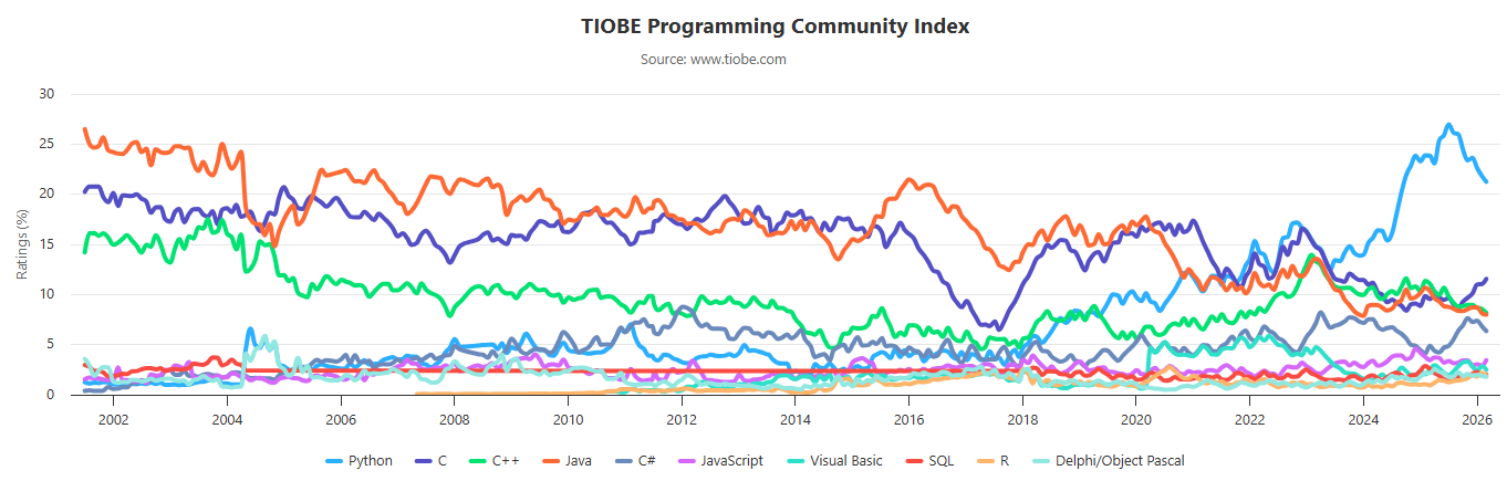 TOP 10 编程语言 TIOBE 指数走势(2002-2026)