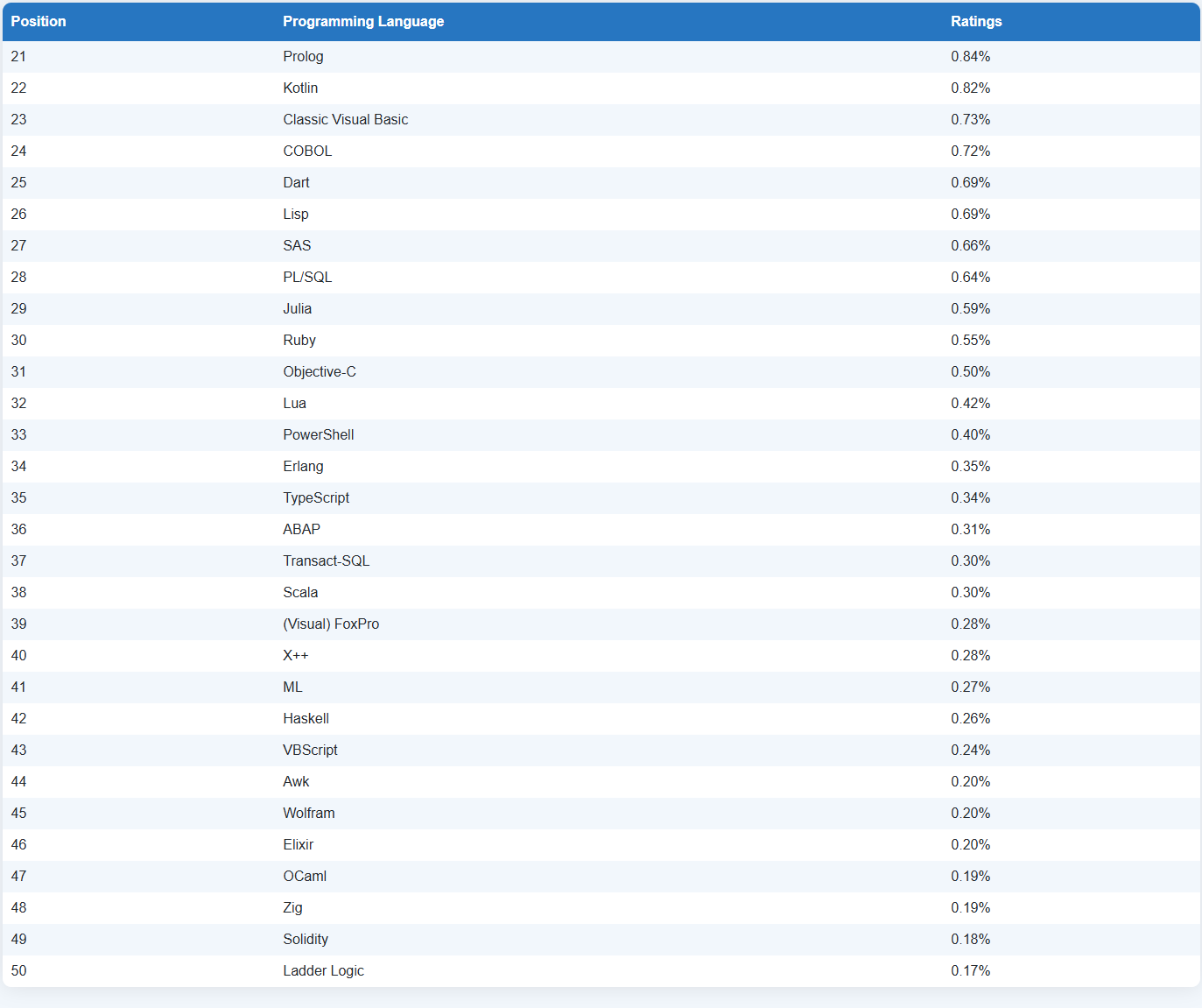 ActionScript, Algol, Apex, Applescript, Bash, bc, Caml, CFML, CL (OS/400), Clojure, CoffeeScript, Common Lisp, D, F#, Forth, GAMS, GML, Groovy, Hack, Icon, Inform, Io, J, J#, JScript, JScript.NET, Korn shell, LabVIEW, Logo, LotusScript, Modula-2, Mojo, MQL5, NATURAL, NetLogo, OpenCL, PL/I, PostScript, Q, REXX, RPG, S, Scheme, Small Basic, SPARK, SPSS, Tcl, V, VHDL, Xojo