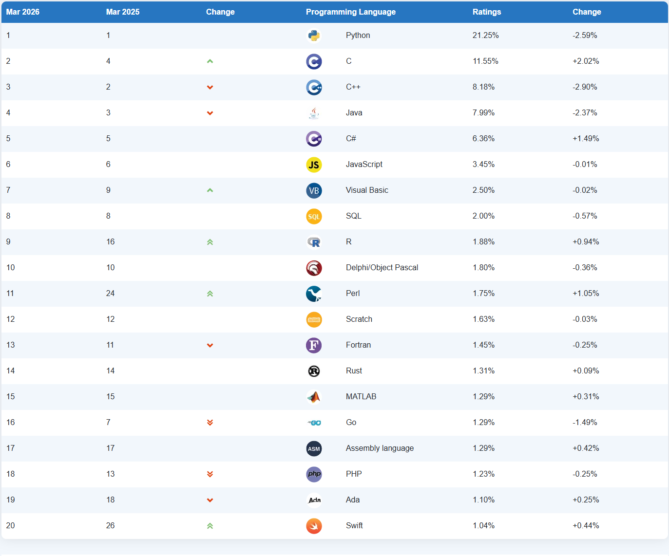 TIOBE 公布了 2026 年 3 月的编程语言排行榜。