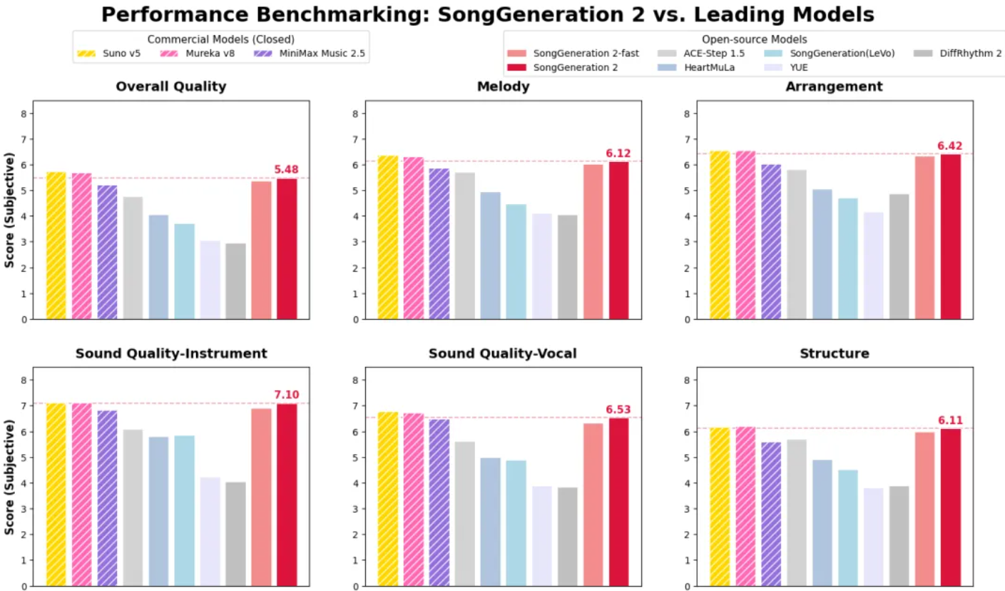 实验数据显示,SongGeneration 2 的整体生成质量已成功对齐商业级能力。在整体质量、旋律、编曲等多个维度上,SongGeneration 2 的表现甚至超过了MiniMax 2.5。