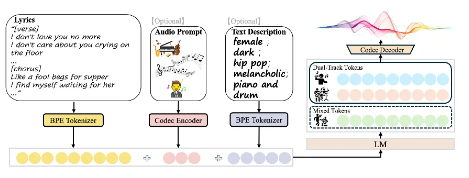 - 多轨表征(Dual-Track Tokens):分别代表人声和伴奏轨道,在语义信息的基础上进一步确定不同轨道局部的细粒度声学变化。