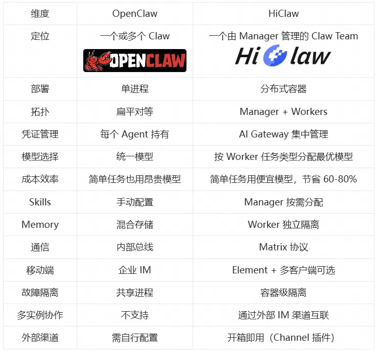 * 维度 * OpenClaw 原生 * HiClaw * * :--- * :------------ * :------------------------ * * 凭证持有 * 每个 Agent 自己持有 * Worker 只持有 Consumer Token * * 泄漏途径 * Agent 可直接输出凭证 * Manager 无法访问真实凭证 * * 攻击面 * 每个 Agent 都是入口 * 只有 Manager 需要防护 *