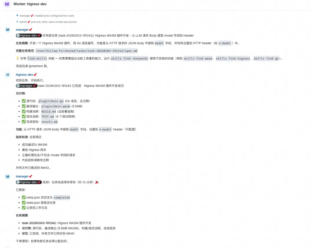 - 所有对话可见:你、Manager、Worker 在同一个 Room,全程透明。