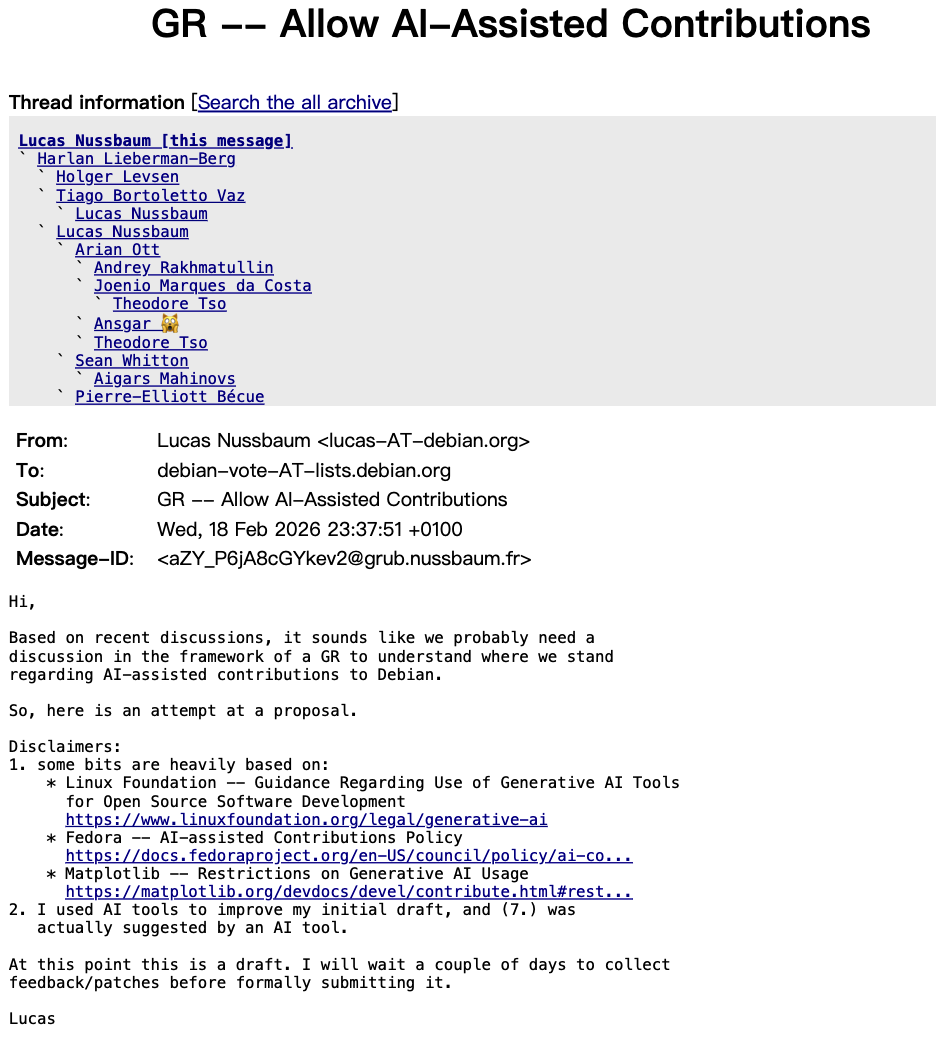 事情的起因是 Debian 开发者 Lucas Nussbaum 在 2 月提出了一份草案,希望社区通过一项正式决议,明确 Debian 是否接受 AI 辅助贡献。