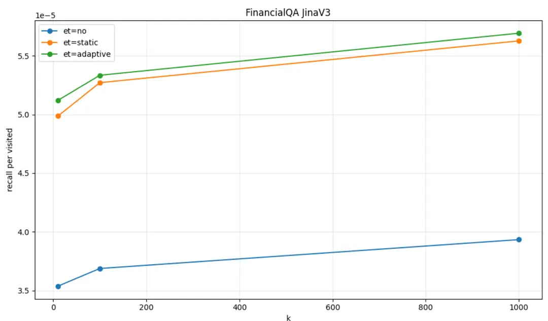 为了进行可视化,我们可以绘制基于耐心的提前终止(标记为 et=static)与默认 HNSW 行为(标记为 et=no)在多个数据集(FinancialQA 和 Quora)以及模型(JinaV3 和 E5 -small)上的每访问节点召回率对比。