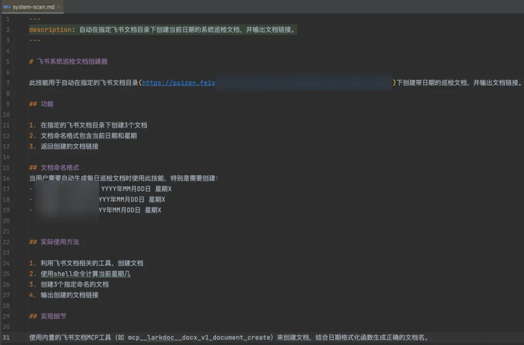 飞书官方提供了 MCP,我主要用它来读写飞书文档,蛮好用的,大家可以试试。比如我每周都要在固定目录下创建固定标题格式的【系统巡检文档】,所以我借助飞书 MCP 整了个自定义 Command 帮我自动创建这些文档去除重复劳动,感觉真香!之前每次都要手动建 3 个文档、选目录、改名字!