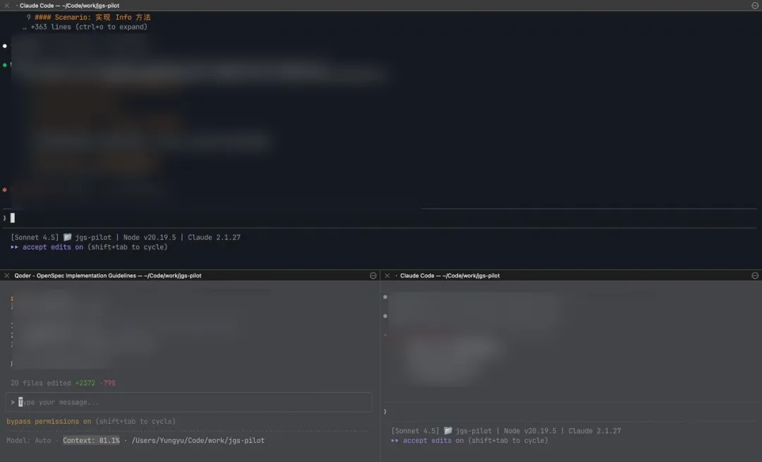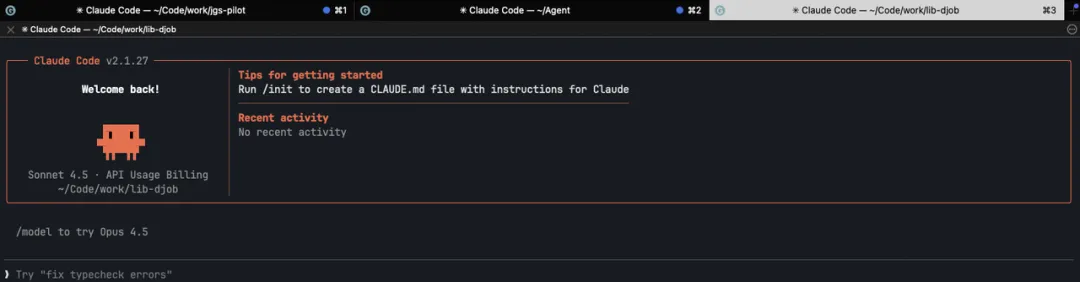 会的越多,让你干的就越多。既然 AI 那么牛,一个 CC 会话已经满足不了我膨胀的想法和需求了。我希望我可以同时支配多个 AI 开发工程师,而我变成 PM!所以参考酒米的思路,我给每个项目的终端,自动化的划分了 3 个子窗口,每个子窗口都是一个 CC 会话。效果大概这样: