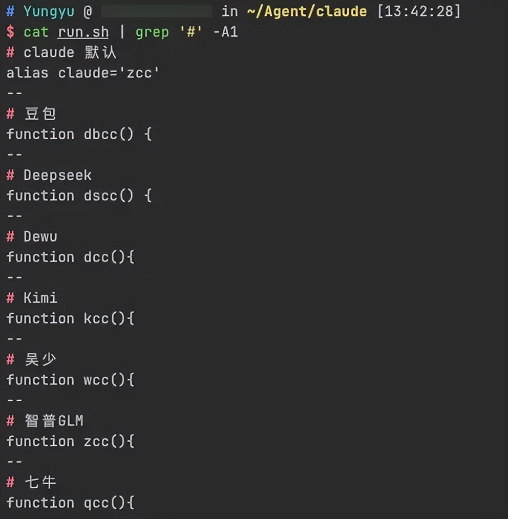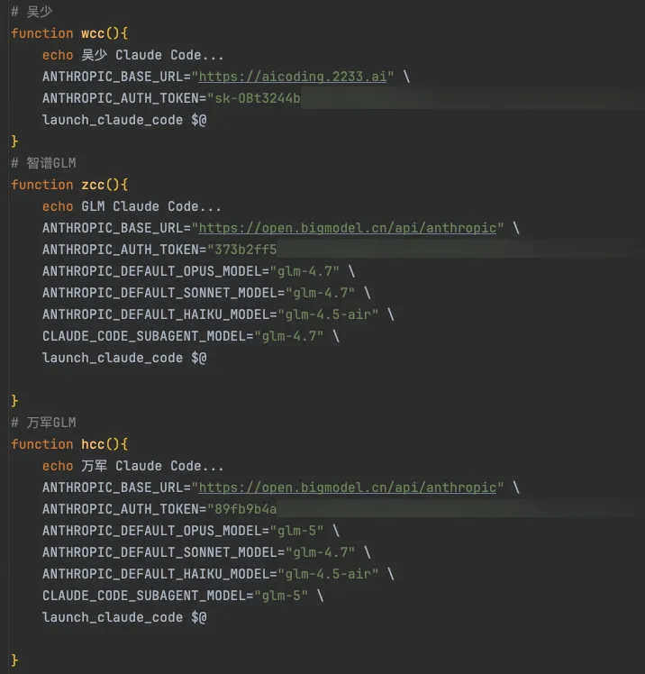 我通过自定义 Shell 函数来实现便捷的模型切换,不同的场景、不同的任务使用不同的模型。基本原理就是,CC 支持环境变量注入 LLM 配置信息,因此我只需要按场景注入【行内临时环境变量】即可。