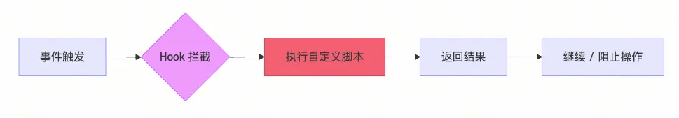 hook 是在特定事件触发时自动执行的脚本,用于自定义工作流、拦截危险操作、自动格式化代码等。就类似 Linux NetFilter,CC 在很多地方植入了流程执行的劫持点,将流程上下文交给用户开发的脚本或者命令。