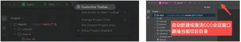 因为某个原因,我在 IDE 里打开了一个项目 A →准备写代码了,点击 IDE 里的某个【按钮】,左边屏幕自动【新建】一个项目 A 的 CC 会话终端并激活到前台显示 → 我跟左边的 CC 对话,让他干活 → 我在中间的 IDE 里评审、调试、诊断 → 因为某些原因我又要在 IDE 打开一个别的项目 B → 我再次点击那个【按钮】,左边屏幕自动【新建】一个项目 B 的 CC 会话终端并激活到前台显示 → 我在 IDE 里又切回了项目 A,我又点击了那个【按钮】,左边屏幕自动【切换】到 A 的 CC 会话终端并激活到前台显示。