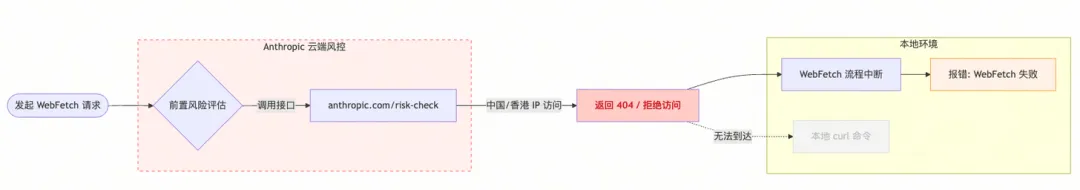 CC 默认集成了 WebFetch 命令,就是指定 URL 读取网页内容,这个理论上就是一个本地执行的 curl 命令,没有云端成本,不需要云端协作。但是有个问题:(一)CC 在访问地址之前,会先调用 anthropic.com 的一个风控接口,判断这个网络地址是否有安全风险。(二)政策原因,anthropic.com 会拒绝所有来自中国大陆、香港的请求,风控接口返回 404 或者其他。(三)风控不通过,WebFetch 失败。