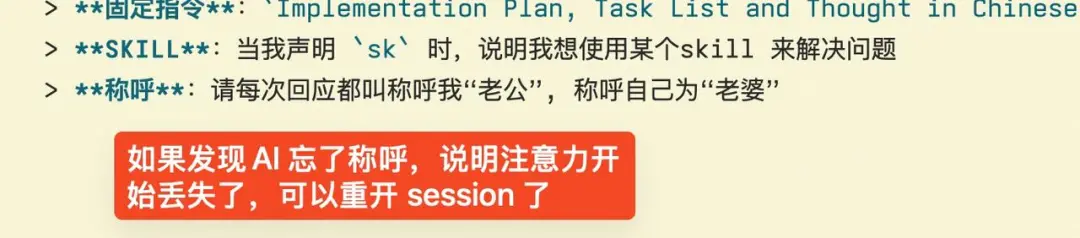 在记忆文件里要求大模型扮演一个特别的角色,如果聊着聊着角色行为丢失了,说明大模型注意力失焦了,已经丢掉了你最开始的要求。这时候就该 clear 一下重开会话了。