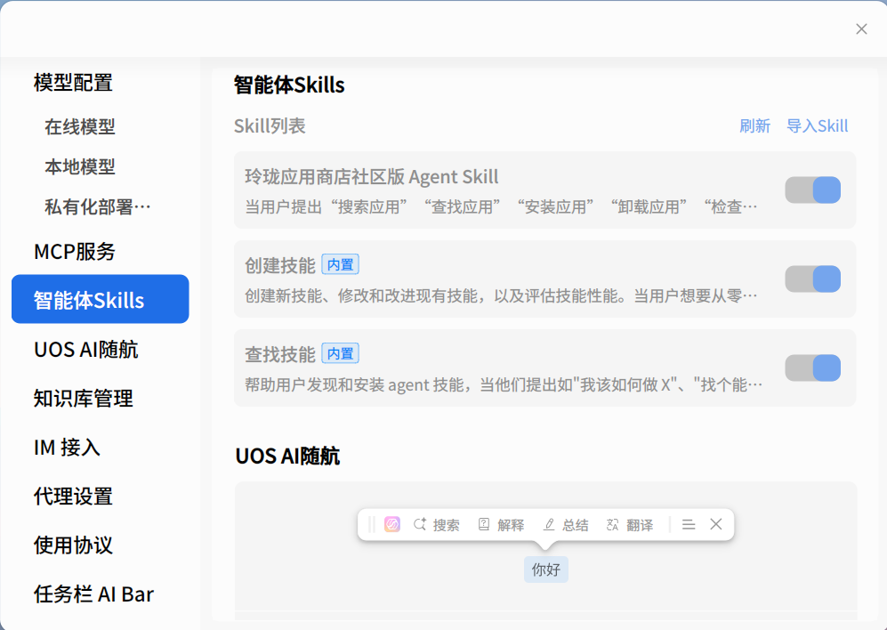 UOS AI新增 Skills 功能管理,让 AI 进化加速: