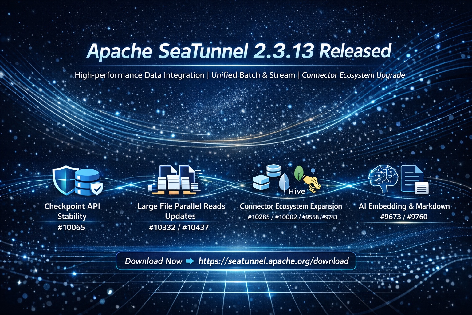 Apache SeaTunnel 社区正式发布 2.3.13 版本!本次发版对于 Apache SeaTunnel 来说是一个里程碑式的进展,带来了诸如 Checkpoint API、Flink 引擎升级、大文件并行处理、多表同步能力、AI Embedding Transform、更加丰富的连接器扩展 等多项重要能力。无论是批量数据处理还是实时 CDC,同步到 Lakehouse,SeaTunnel 都能更高效、更稳定、更智能地支持你的数据集成工作。