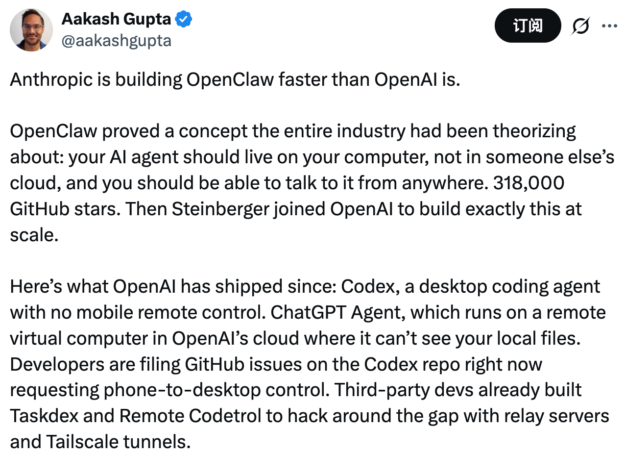 AI 领域知名产品增长与科技分析师 Aakash Gupta 写了一篇分析 Anthropic /OpenAI 智能体产品路线的评论。