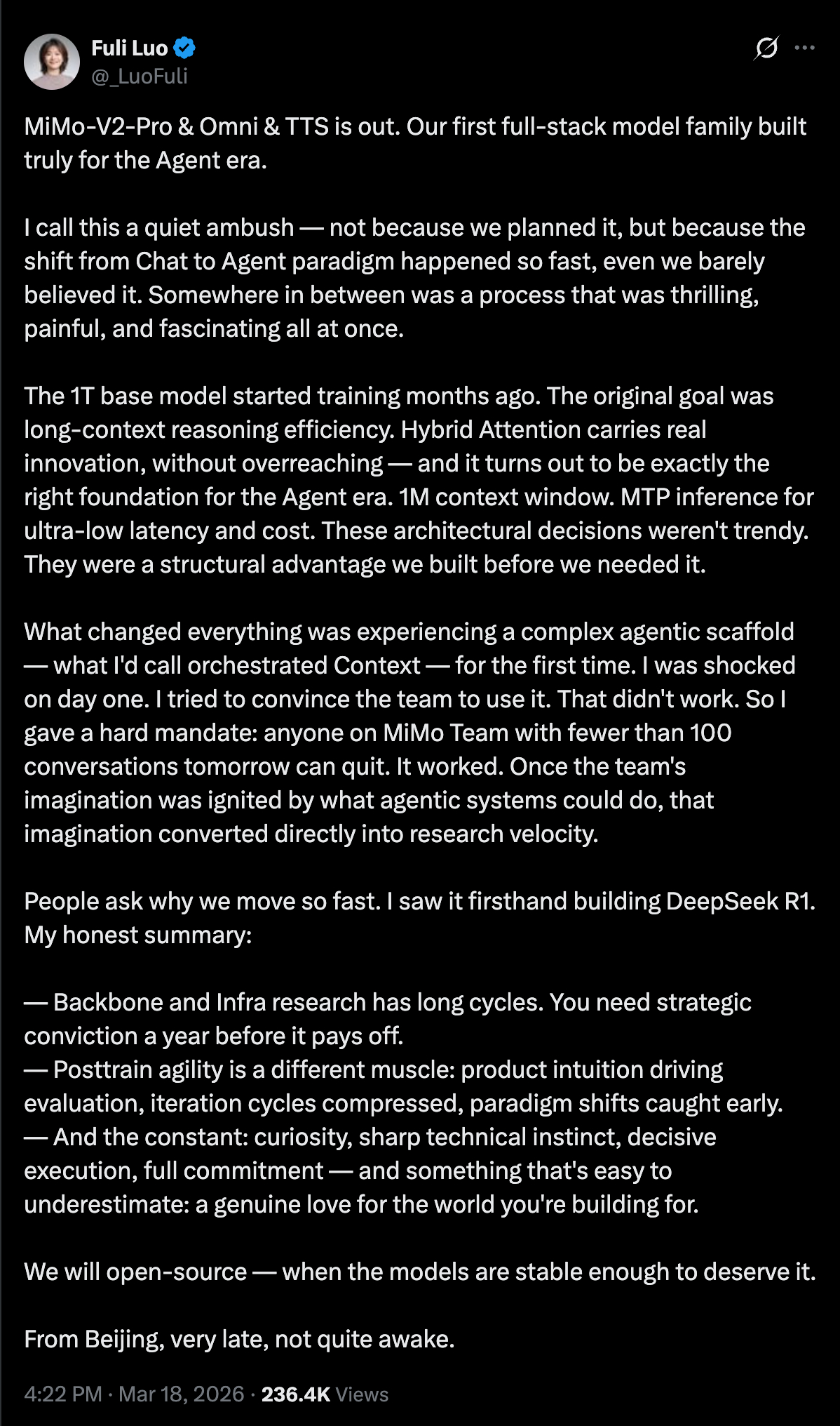 小米近日推出三款大模型 MiMo-V2-Pro & Omni & TTS,其负责人罗福莉在社交平台分享了关于它们的开发经历: