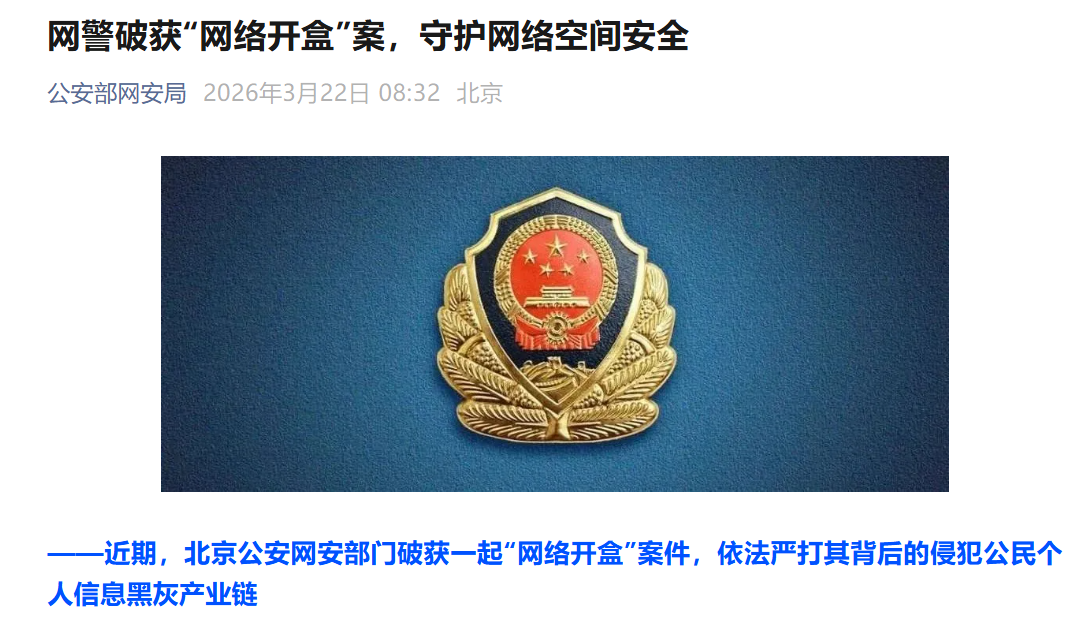 公安部网安局消息称,北京公安机关近日办理一起非法利用信息网络案时,发现其背后存在一个规模庞大的“网络开盒”、侵犯公民个人信息黑灰产业链,经过对涉案点位进行持续工作,逐步锁定王某康、林某武、王某、刘某彪、孙某恒等5名犯罪嫌疑人。