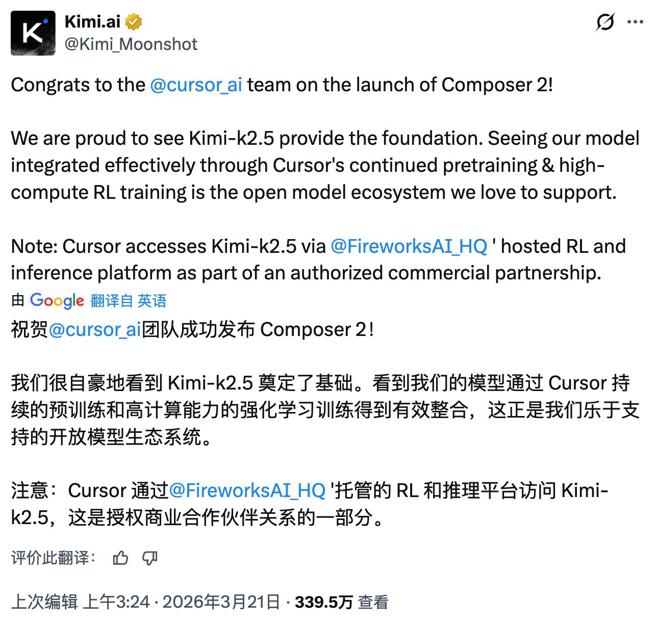 值得关注的是,Moonshot AI官方X账号随后发布祝贺帖,透露Cursor是通过与Fireworks AI的"授权商业合作"合法使用Kimi模型。该账号表示:"看到Kimi-k2.5提供基础支持,Cursor通过持续的预训练和高算力强化学习训练有效集成我们的模型,这正是我们所支持的开放模型生态。"这一表态为整起争议画上了合规性注脚,也侧面印证了中国开源模型在全球产业链中的渗透深度。