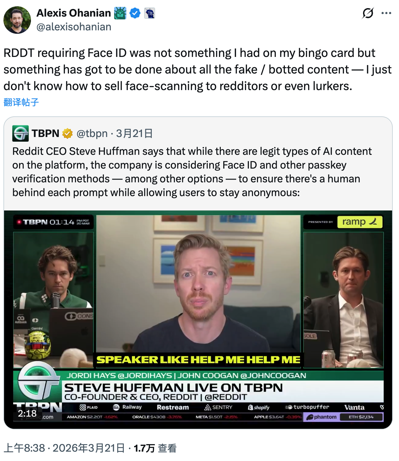 Reddit联合创始人、前执行主席亚历克西斯·奥哈尼安(Alexis Ohanian)在X平台上表示:"我从未预料到Reddit会要求Face ID,但我也同意必须对机器人产生的虚假内容采取措施。"他同时也坦承:"我只是不知道该如何向Reddit用户或潜水用户推销'面部扫描'这个概念。"