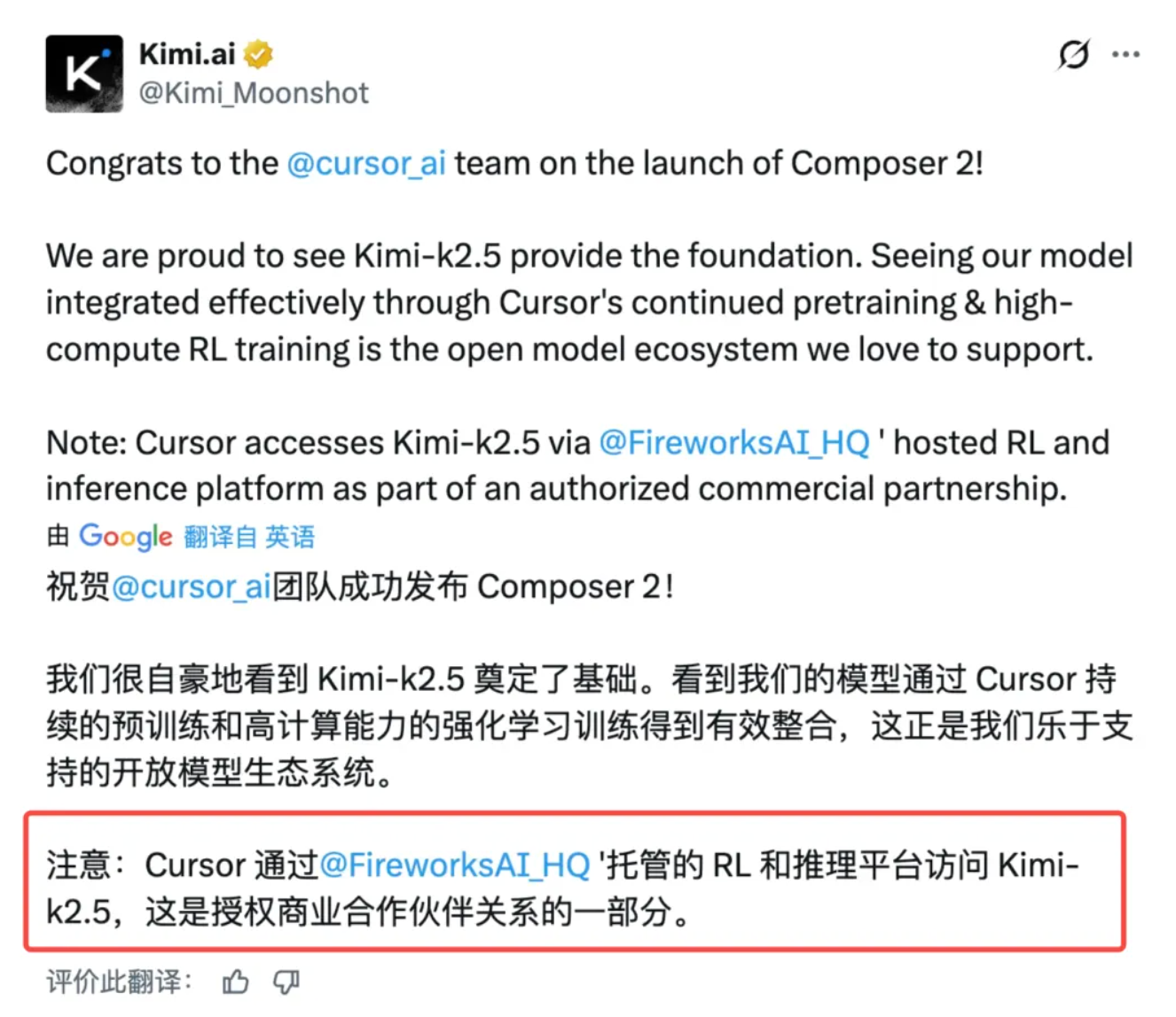 我关注到月之暗面的公开说明中有这么一句话,我图片中圈红框了:Cursor 通过 @FireworksAI_HQ 托管的RL和推理平台访问 Kimi-K2.5,这是授权商业合作伙伴关系的一部分。