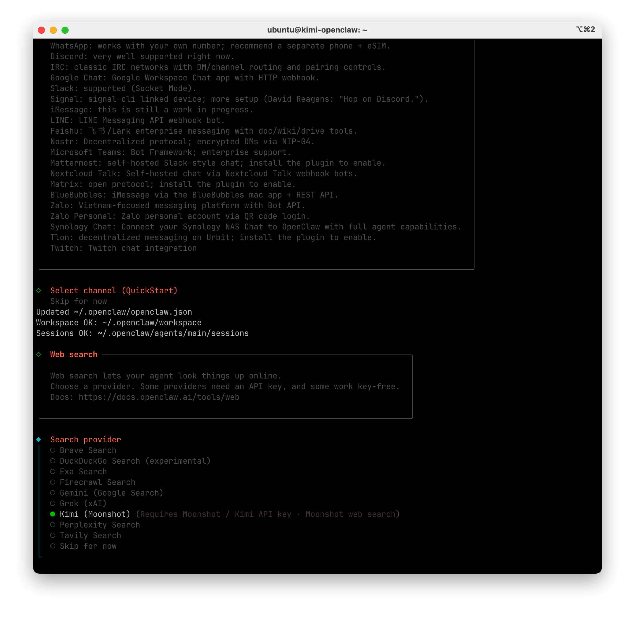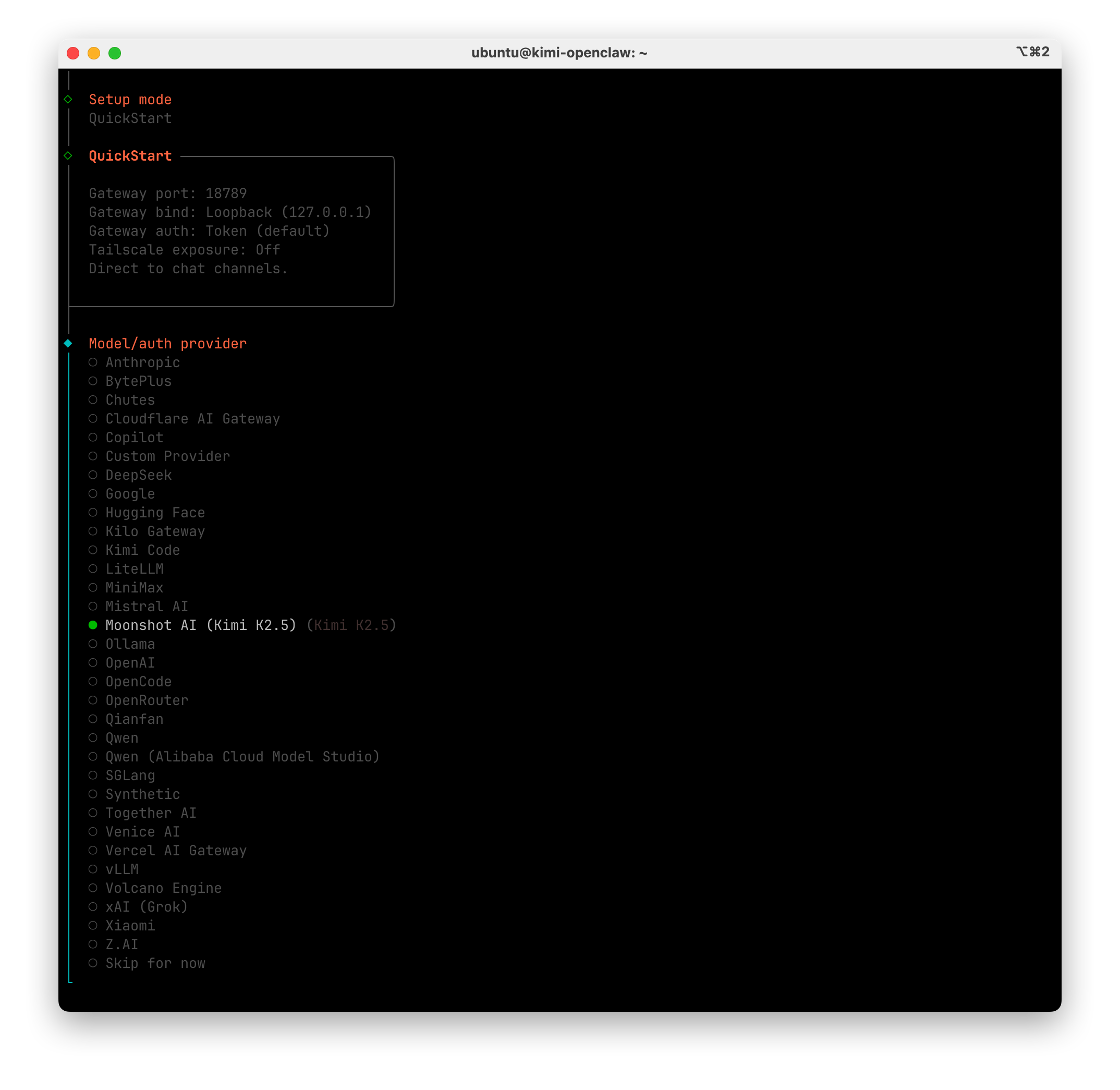 - 选择 Model,这里我们选择 OpenClaw 创始人推荐的 Moonshot AI(Kimi K2.5)进行作为基础模型。