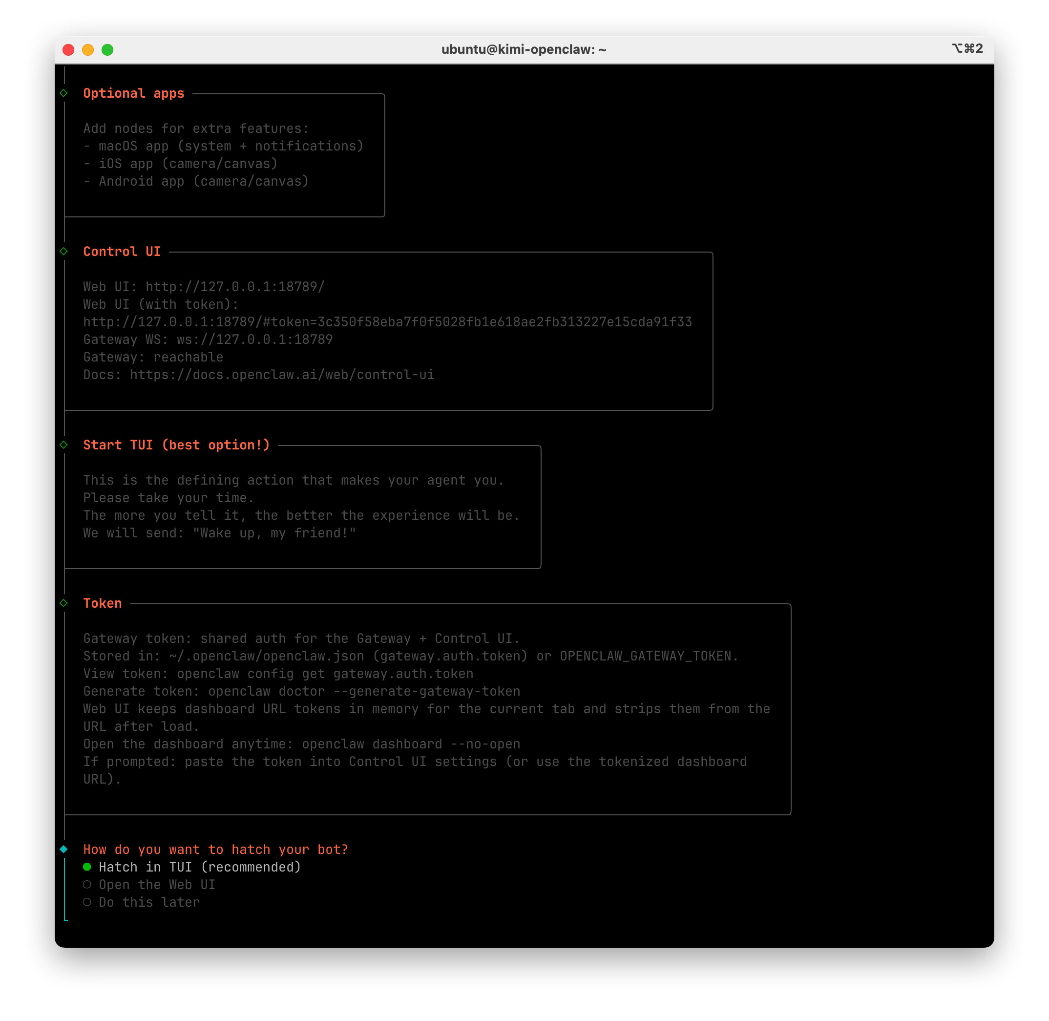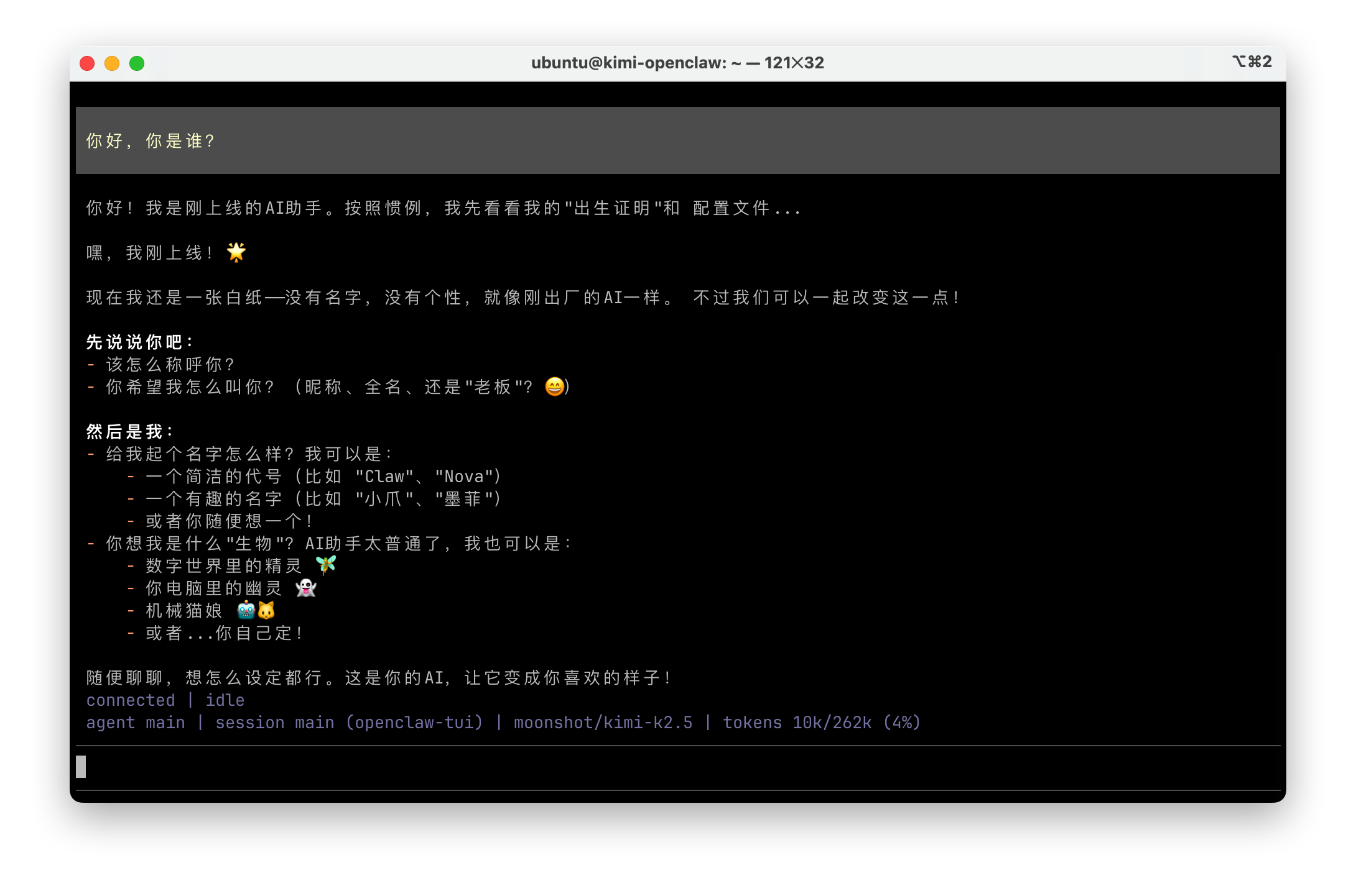 - 输入 openclaw tui 可返回 tui 继续聊天