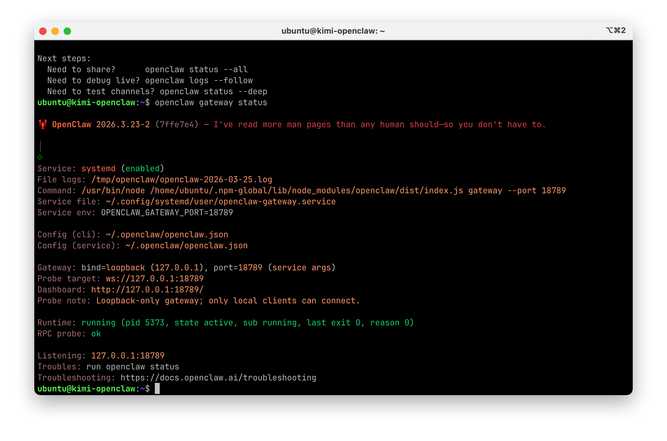 - 输入 openclaw gateway status 可查看 gateway 状态