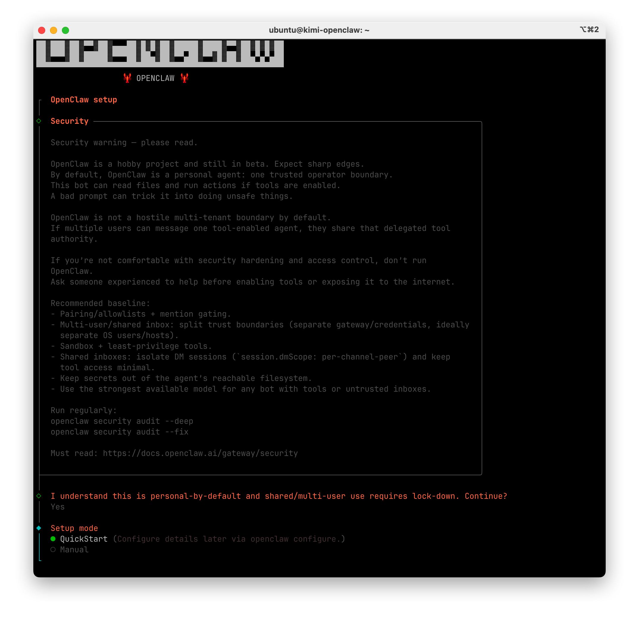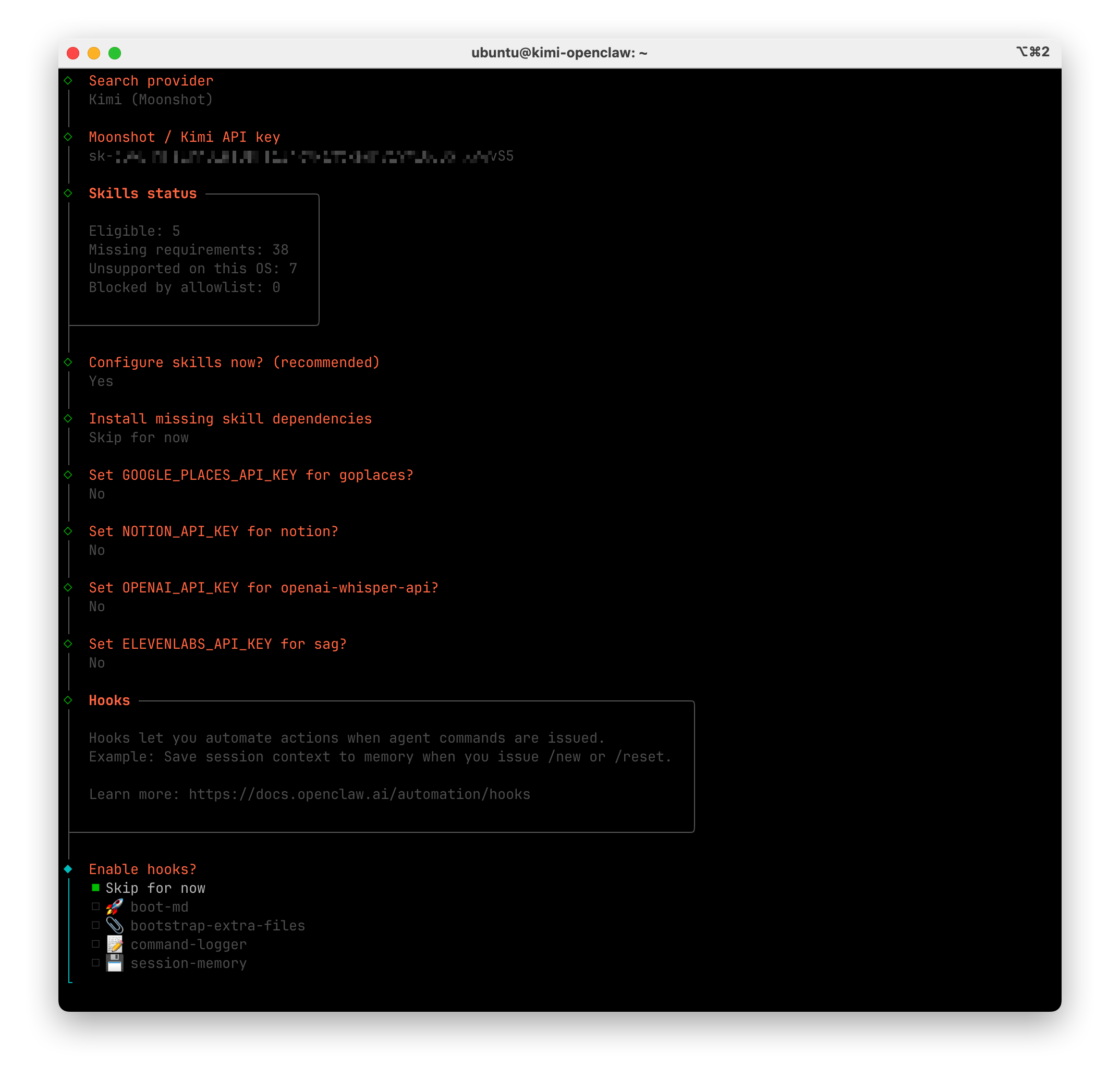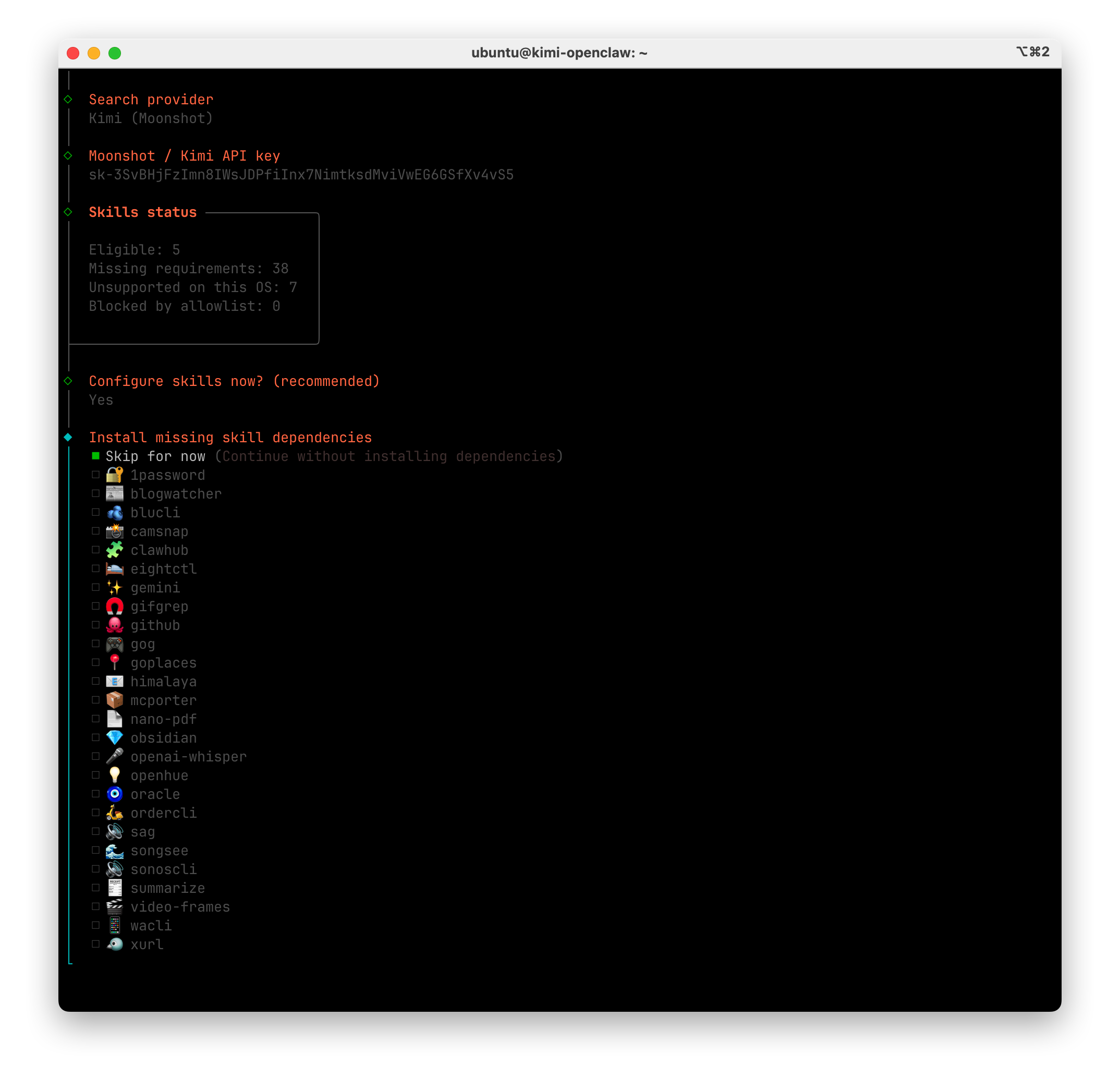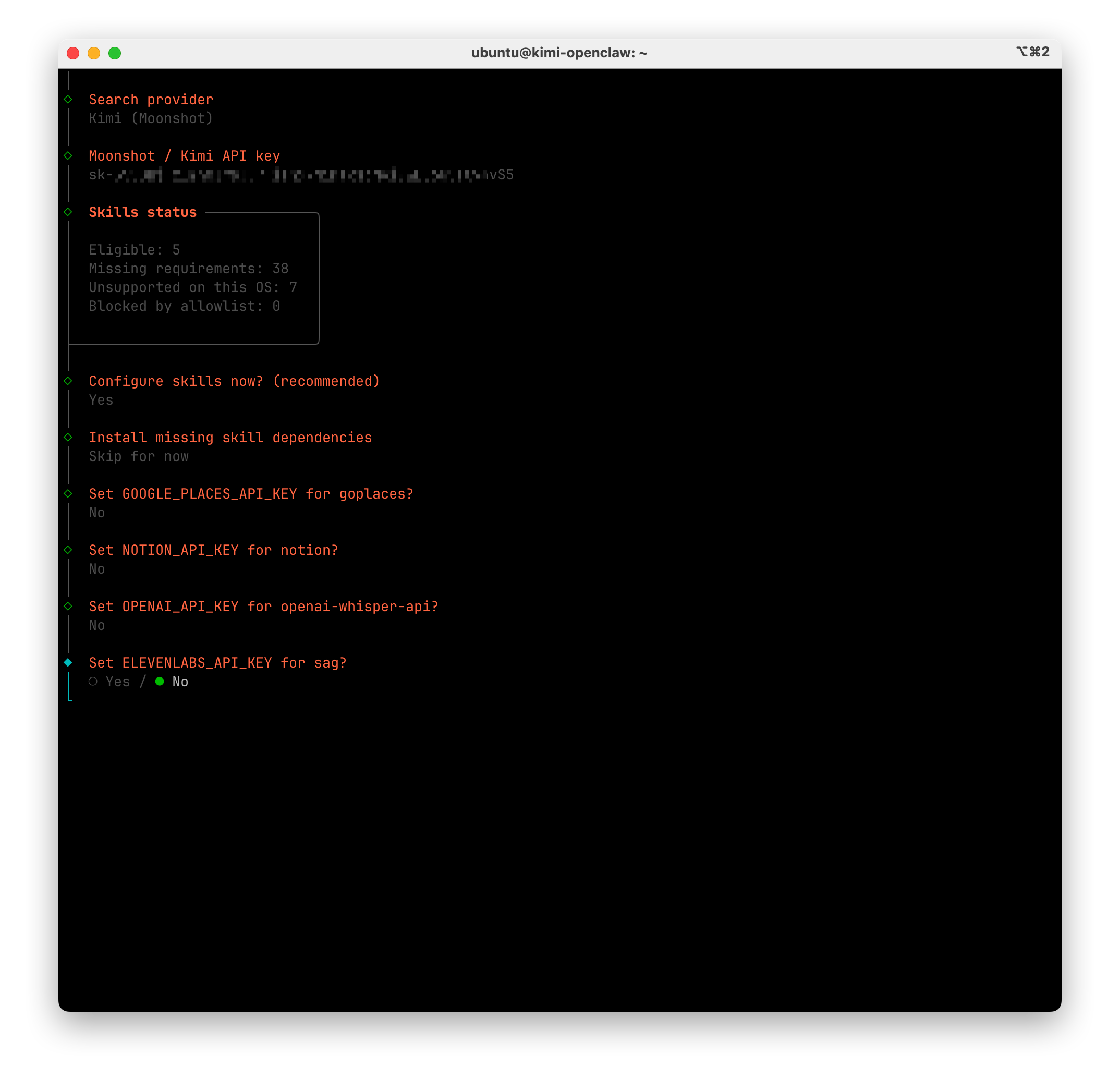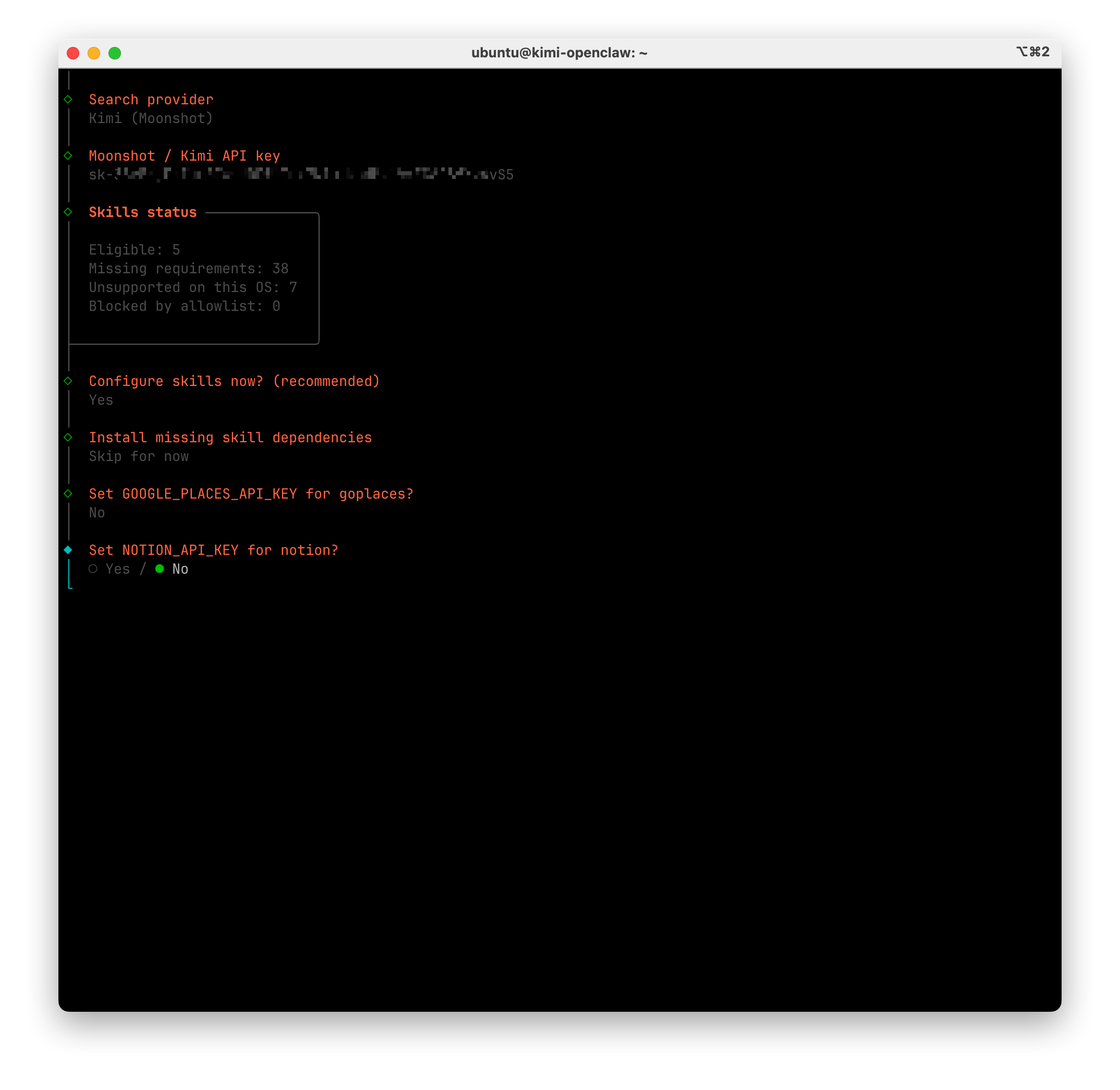 - 选择你 OpenClaw 的技能和一些配置,选择 Yes