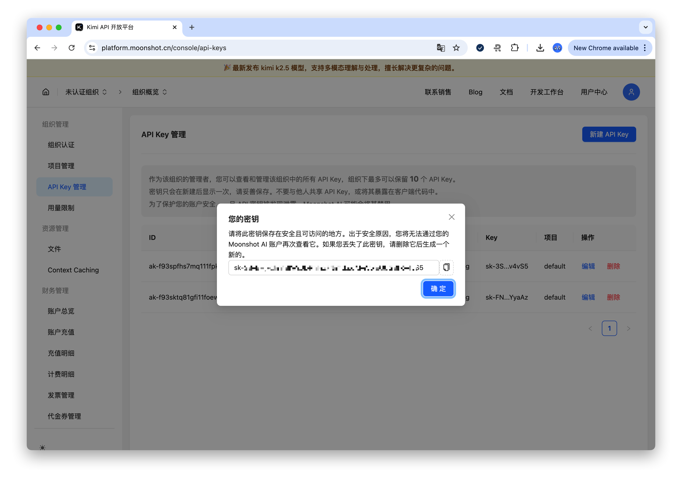 - 点击左侧的 API Key 管理,创建 API Key,复制弹出的密钥字符
