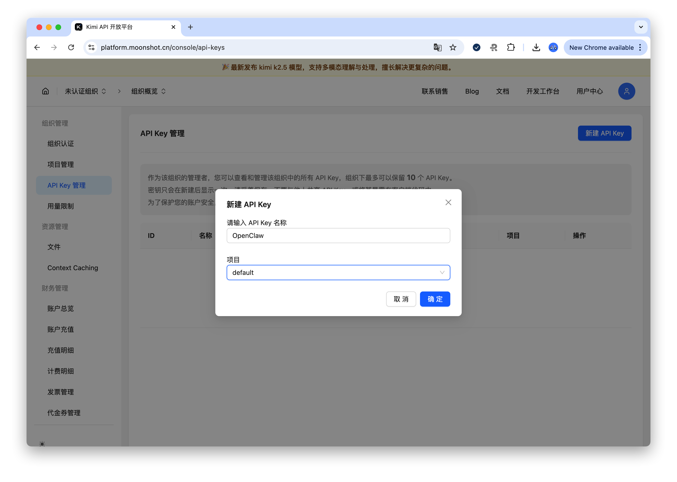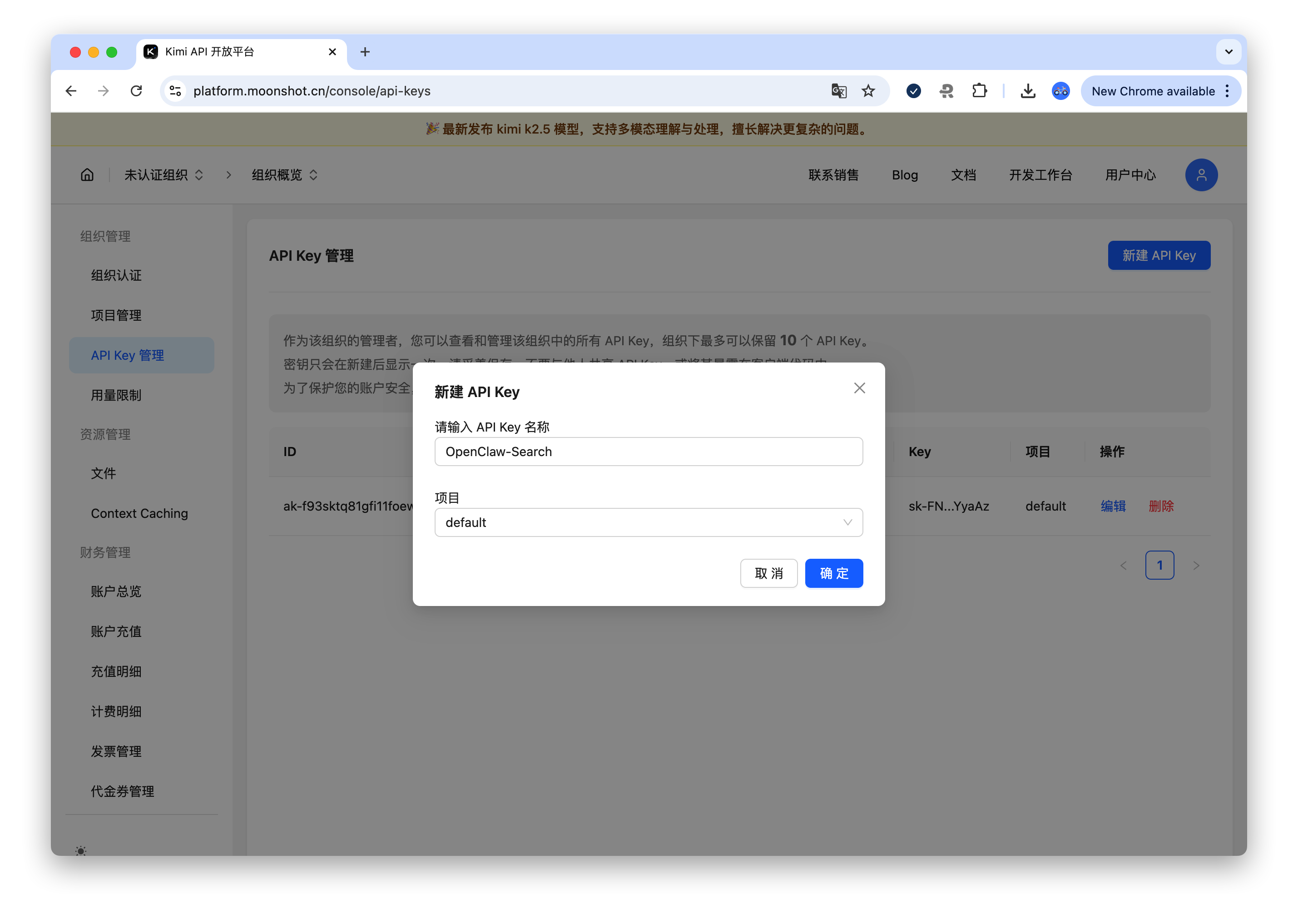 - 然后回到 Kimi 工作台,创建一个搜索专用的 API Key