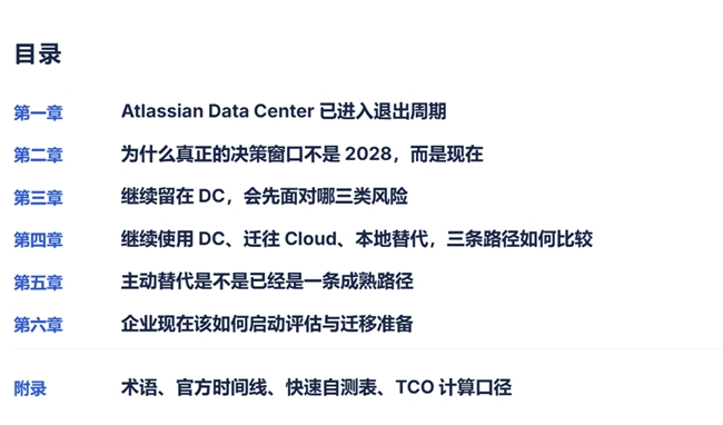 对仍在使用 Jira / Confluence DC、并正在评估后续路径的团队来说,现在真正需要的,已经不是更多观点,而是一份可以直接用于内部评估的决策材料。企业要面对的,也不只是一次公告变化,而是对时间线、许可边界、扩容风险和路径选择的重新判断。