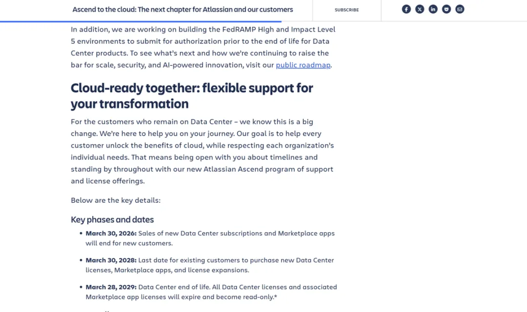 但对仍在扩团队、扩项目、扩协作边界的组织来说,真正的关键不是“今天能不能用”,而是未来两三年还能不能继续按原来的节奏承载增长。Atlassian 官方已经明确,现有客户新增许可、应用和扩容的窗口只到 2028 年 3 月 30 日,这意味着过去依赖扩容承接增长的路径不会无限期延续。