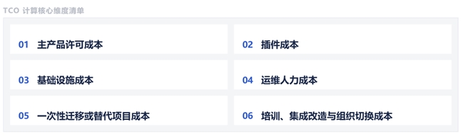 对 DC 用户来说,后面真正要算的账,至少包括六部分:主产品许可、插件成本、基础设施投入、运维与维护人力、迁移或替代的一次性项目成本,以及流程重建、权限调整、集成改造、培训适配等组织切换带来的隐性成本。