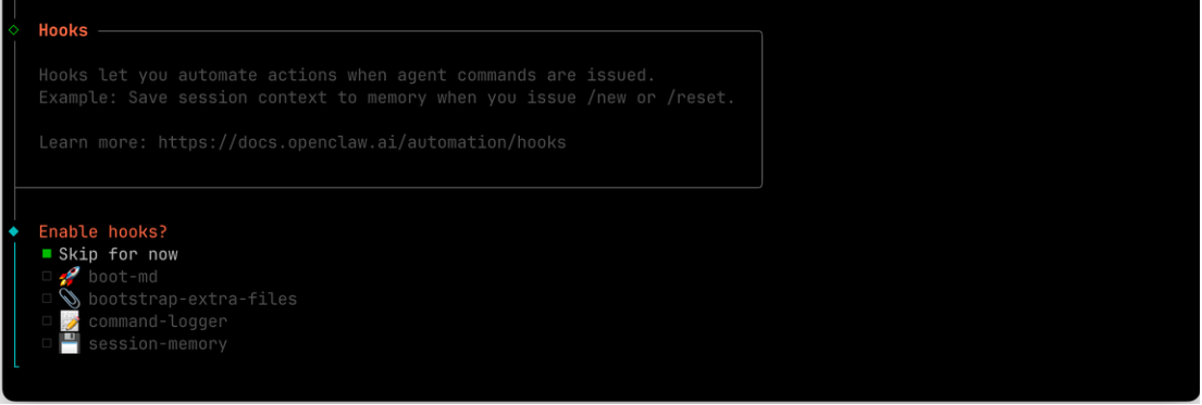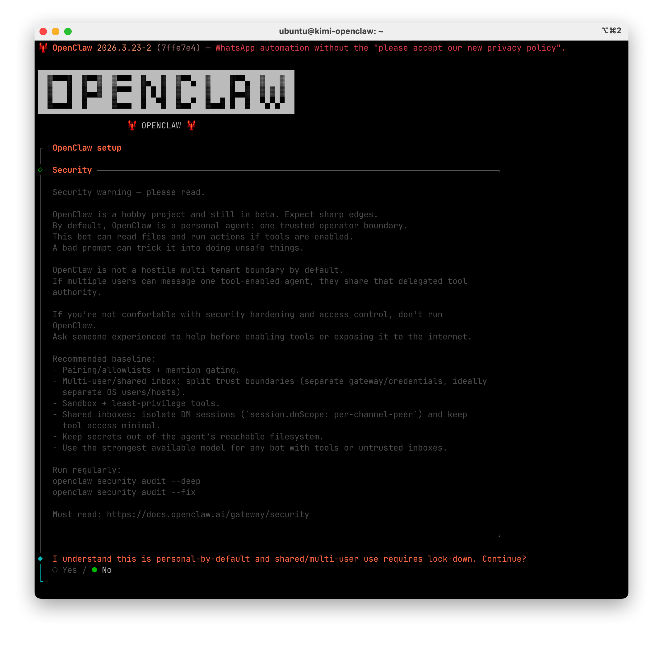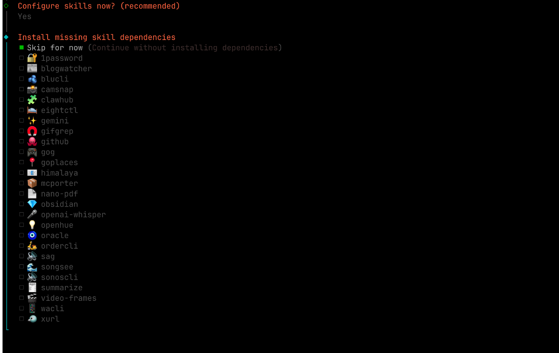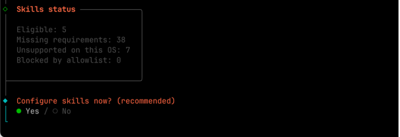 - 选择你 OpenClaw 的技能和一些配置,选择 Yes