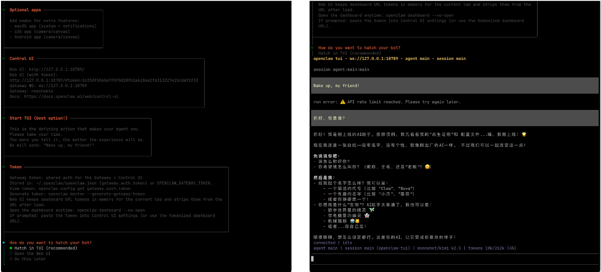 - 输入 openclaw tui 可返回 tui 继续聊天