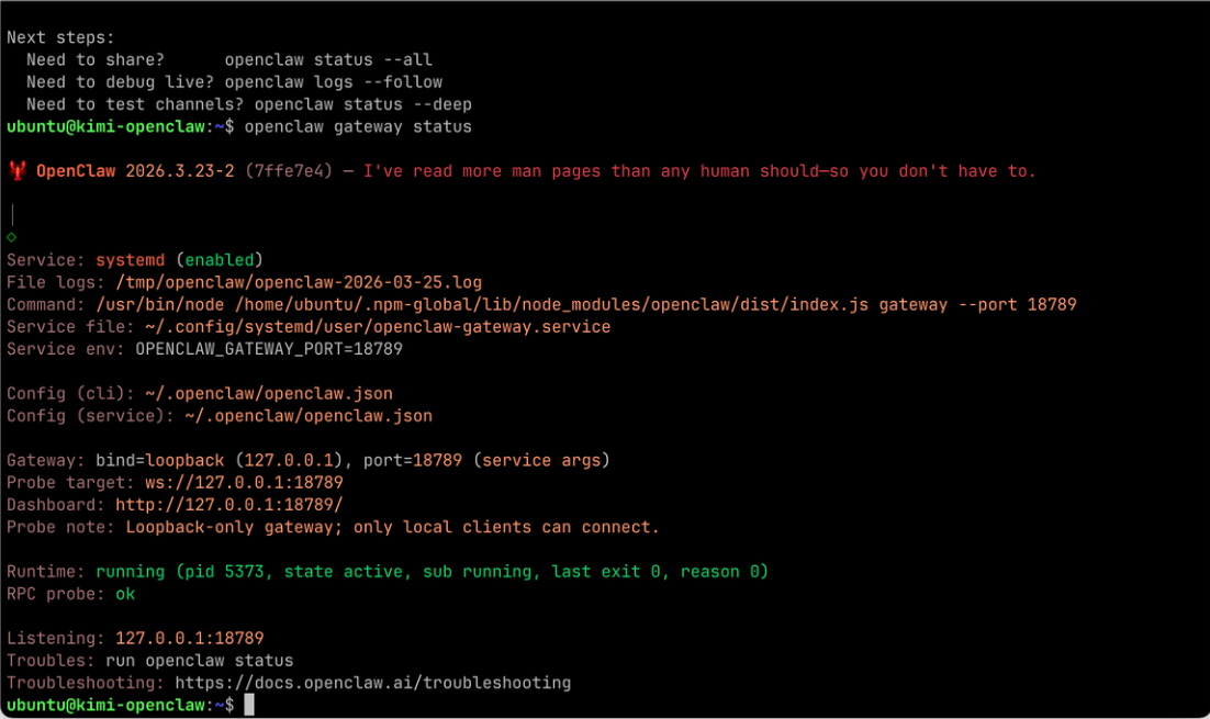 - 输入 openclaw gateway status 可查看 gateway 状态