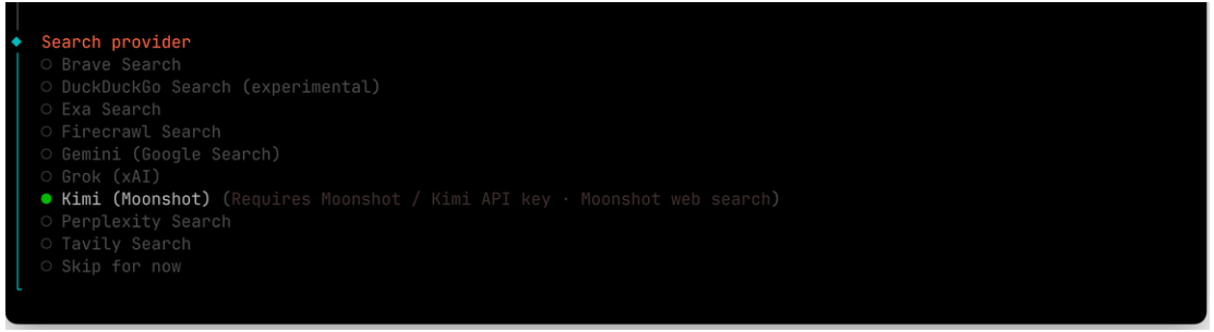 - 选择 Model,这里我们选择 OpenClaw 创始人推荐的 Moonshot AI(Kimi K2.5)进行作为基础模型。