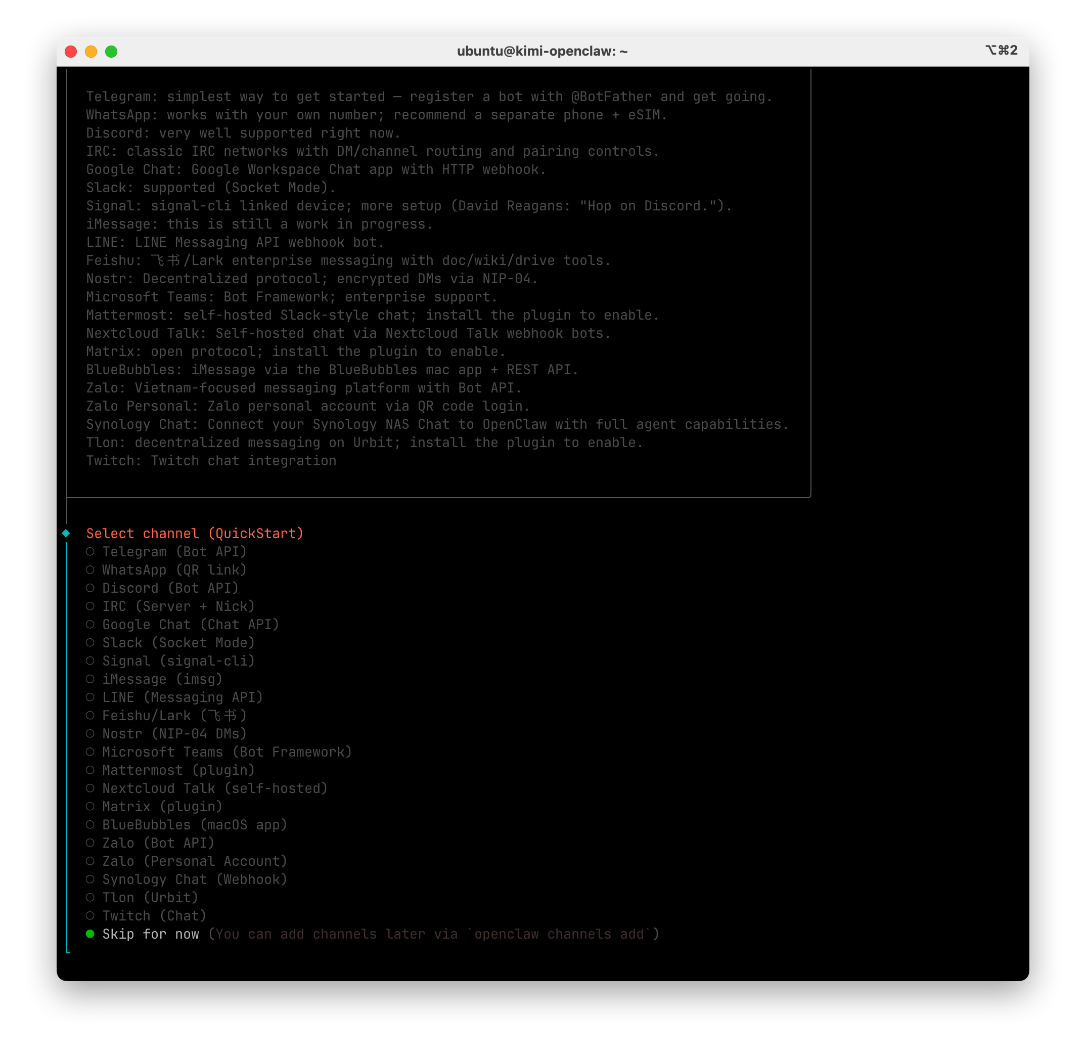 - 选择与 OpenClaw 聊天的载体,我们可以先跳过,使用 tui 进行体验。