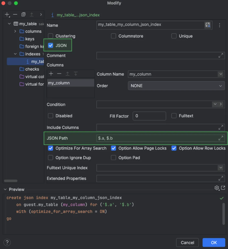 对于 Microsoft SQL Server 引入了对 JSON 索引的支持。用户可以在代码生成中使用索引,也可以在 Create(创建)和 Modify(修改)对话框中使用索引。