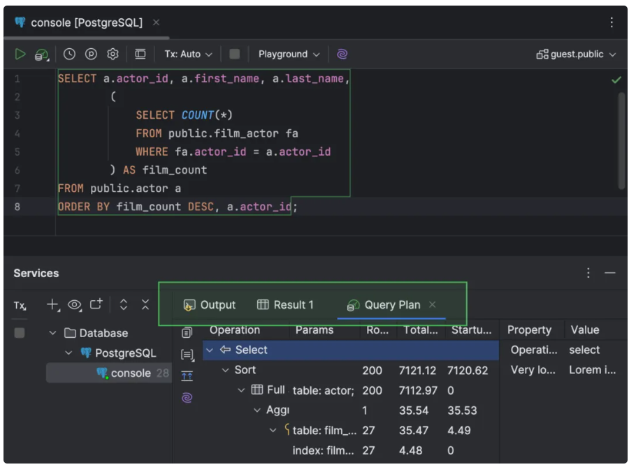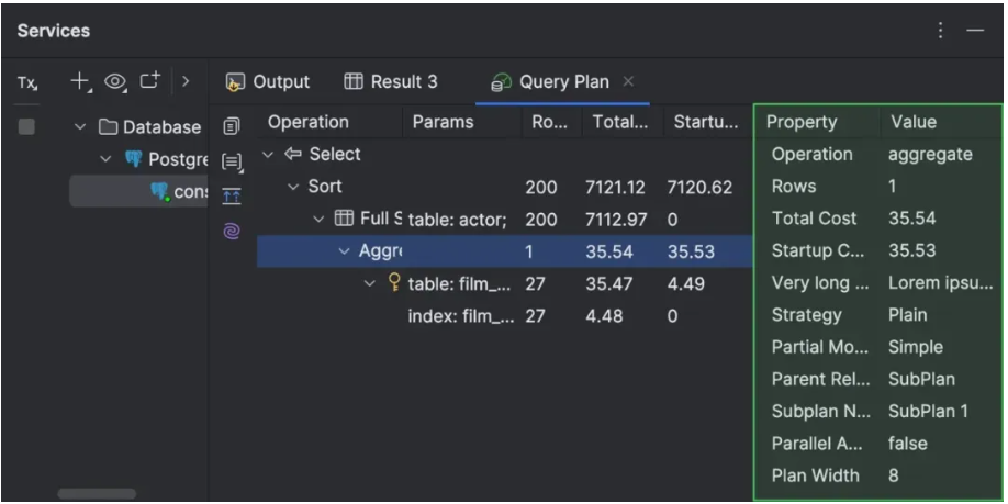 现在,可以在 Services(服务)工具窗口中使用信息更丰富的标签页处理查询执行方案。该标签页现在称为 Query Plan(查询方案),并包含 Total Cost(总成本)和 Startup Cost(启动成本)火焰图的子标签页。